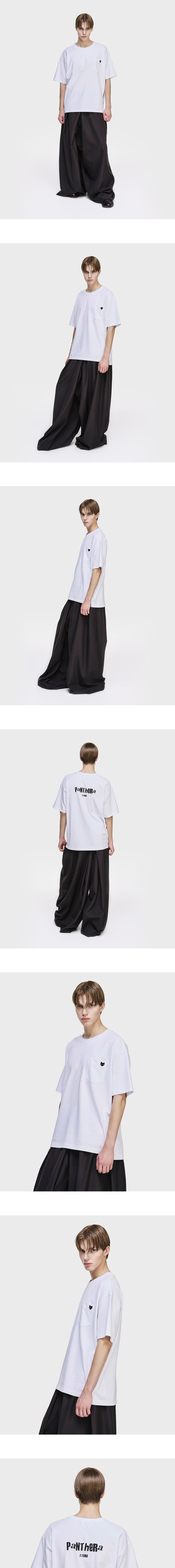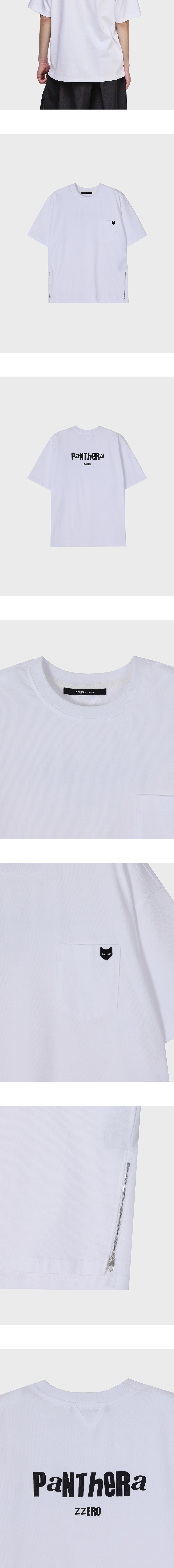 - ZZERO PANTHER T SHIRT - 표면감이 느껴지는 내추럴 코튼 패브릭 - 가슴 포켓 '그레이 아이즈' 팬서 와펜 구성 - 실리콘 핸드 프린트 기법의 PANTHERA ZZERO 아트워크 - 후면 넥 라인 삼각 절개 디자인 - 전/후면 비대칭 사이드 지퍼 디자인 - 세미 오버사이즈 실루엣 - MADE IN CHINA