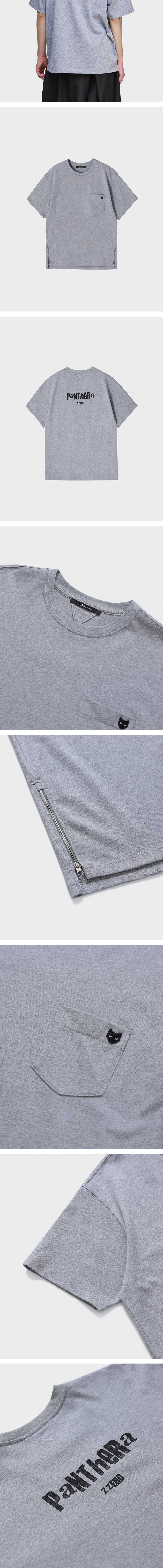 - ZZERO PANTHER T SHIRT - 표면감이 느껴지는 내추럴 코튼 패브릭 - 가슴 포켓 '그레이 아이즈' 팬서 와펜 구성 - 실리콘 핸드 프린트 기법의 PANTHERA ZZERO 아트워크 - 후면 넥 라인 삼각 절개 디자인 - 전/후면 비대칭 사이드 지퍼 디자인 - 세미 오버사이즈 실루엣 - MADE IN CHINA