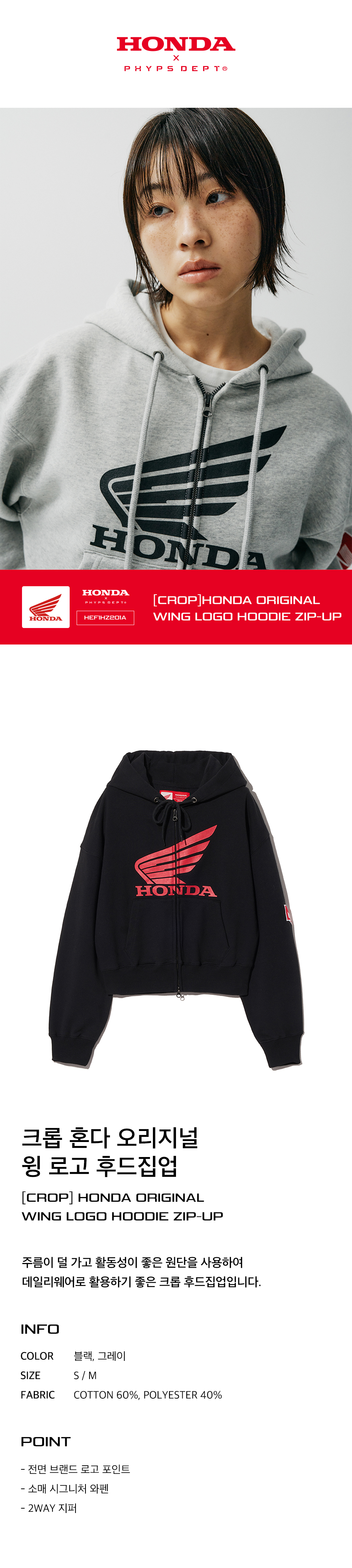혼다 크롭 오리지널 윙 로고 후드집업 블랙