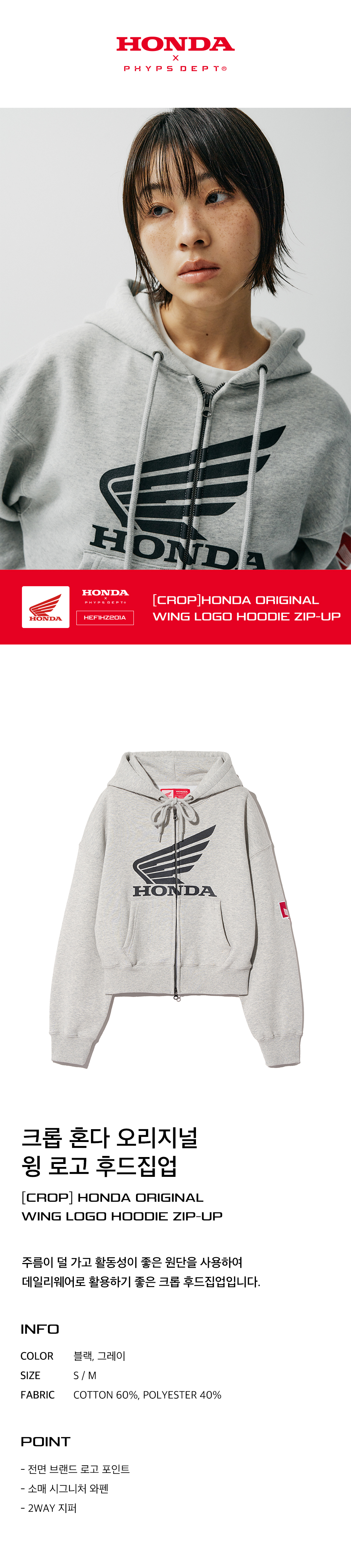 혼다 크롭 오리지널 윙 로고 후드집업 그레이