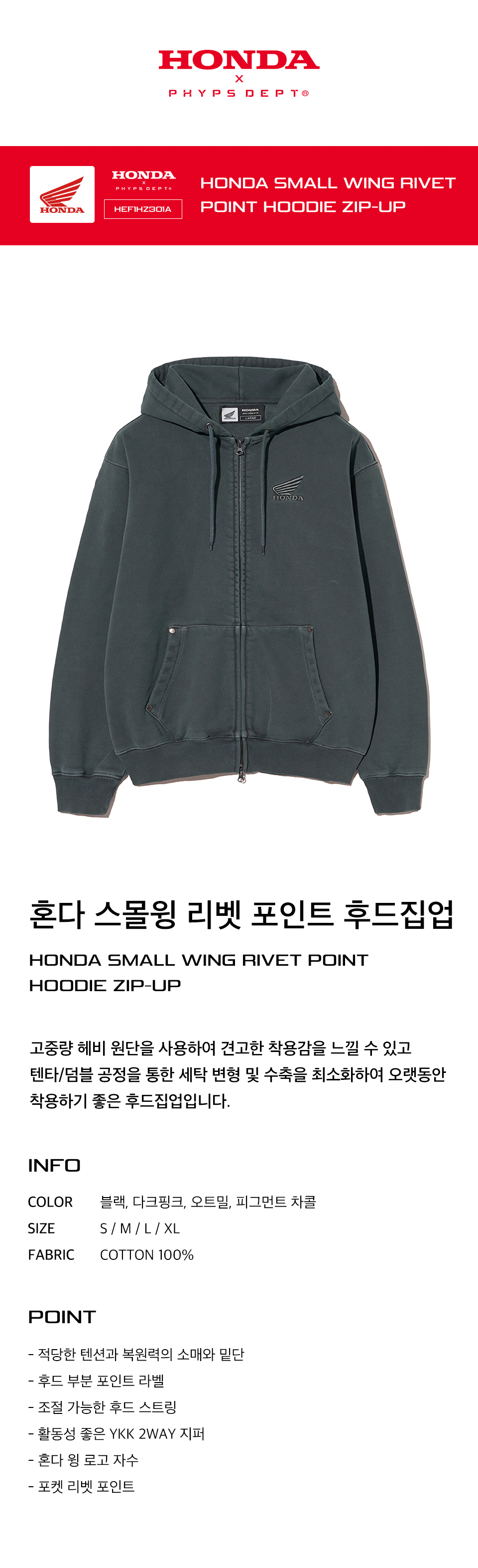 혼다 스몰 윙 리벳 포인트 후드집업 피그먼트 차콜