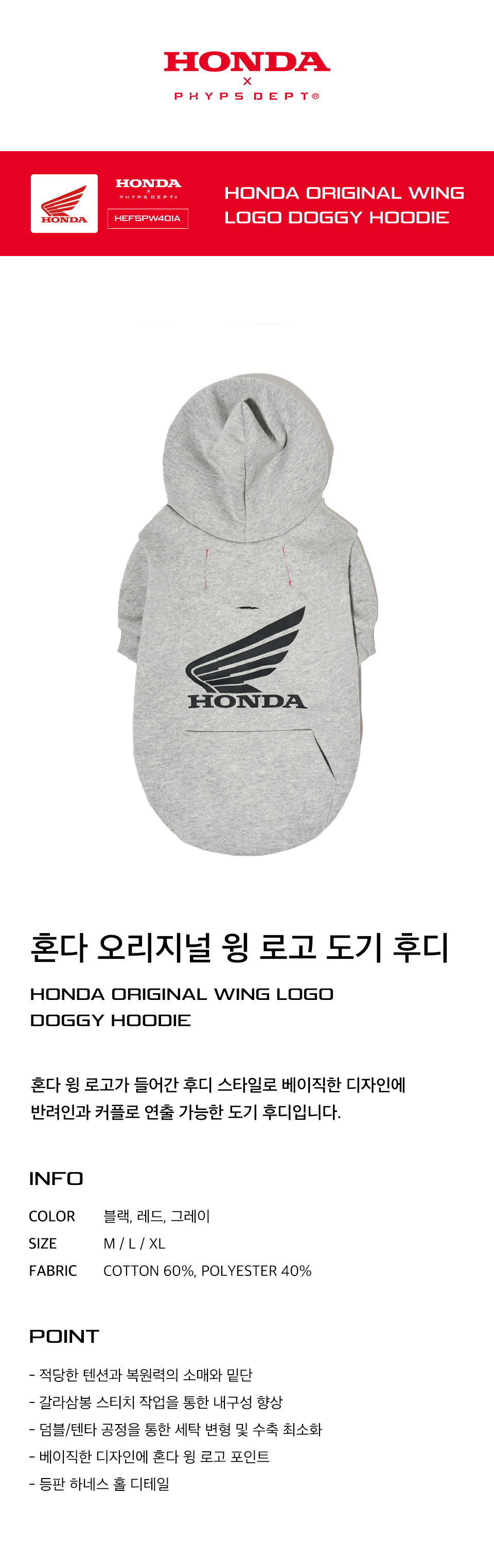 혼다 오리지널 윙 로고 도기 후드 그레이
