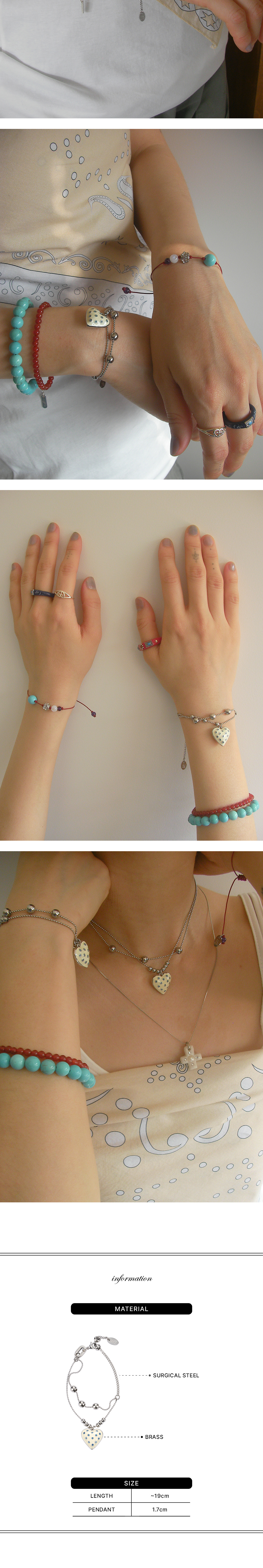 도트 무늬 하트 펜던트와 두 줄 체인이 어우러진 디자인입니다. 조절 가능한 슬라이드 볼 디테일로 길이 조절이 자유롭고 착용이 간편한 제품입니다.