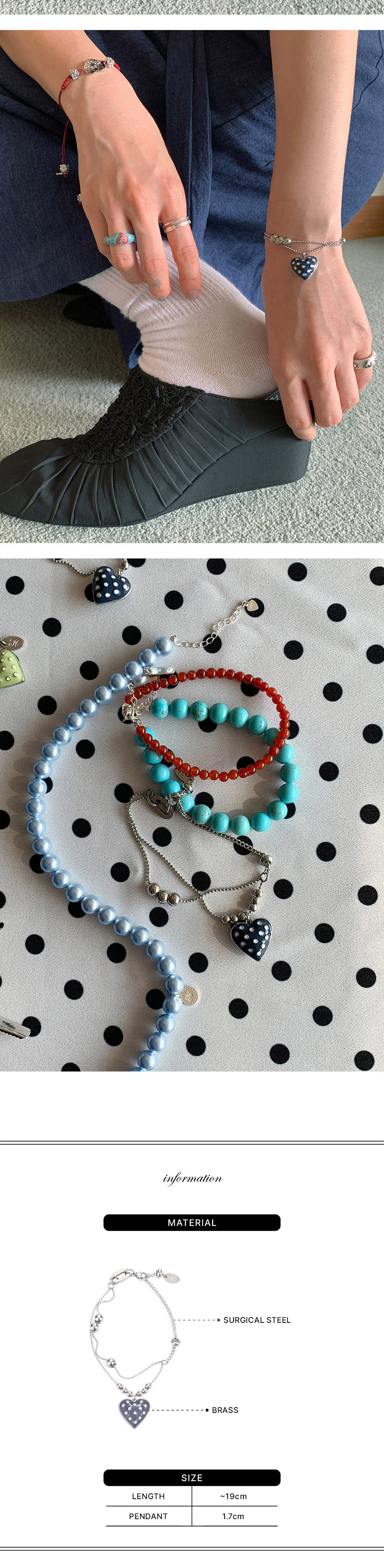 도트 무늬 하트 펜던트와 두 줄 체인이 어우러진 디자인입니다. 조절 가능한 슬라이드 볼 디테일로 길이 조절이 자유롭고 착용이 간편한 제품입니다.