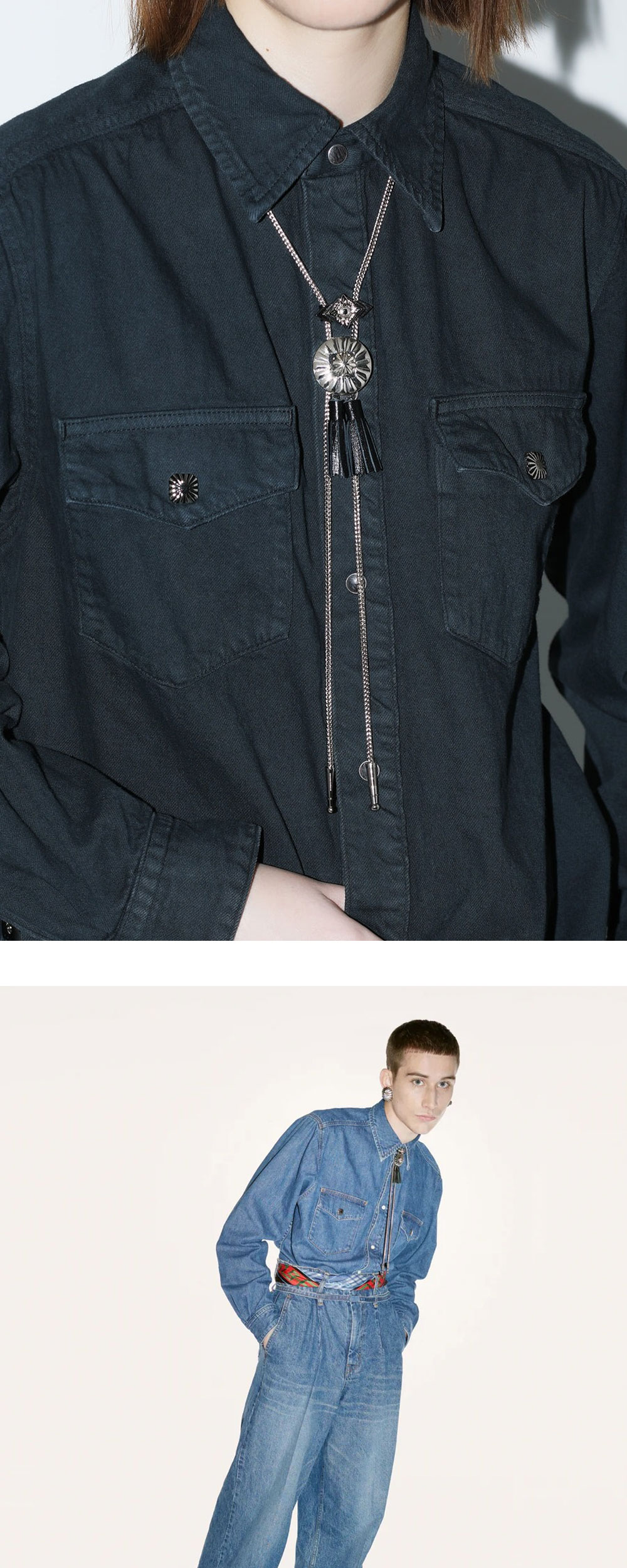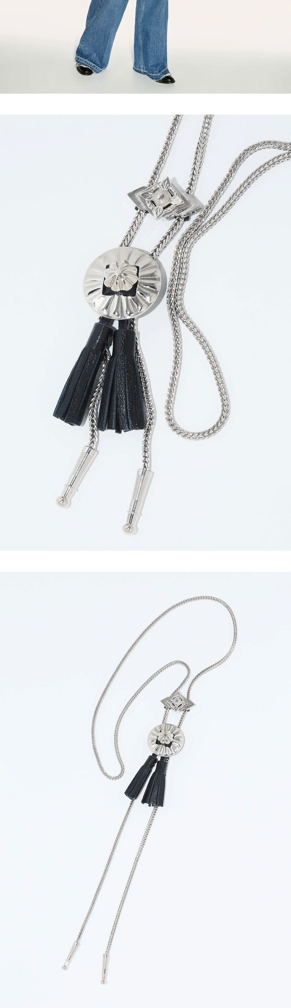 콘초에 가죽 프린지가 결합된 토가 투의 메탈 루프 타이입니다. - 메탈 루프 타이 디자인 - 콘초와 가죽 프린지의 조합