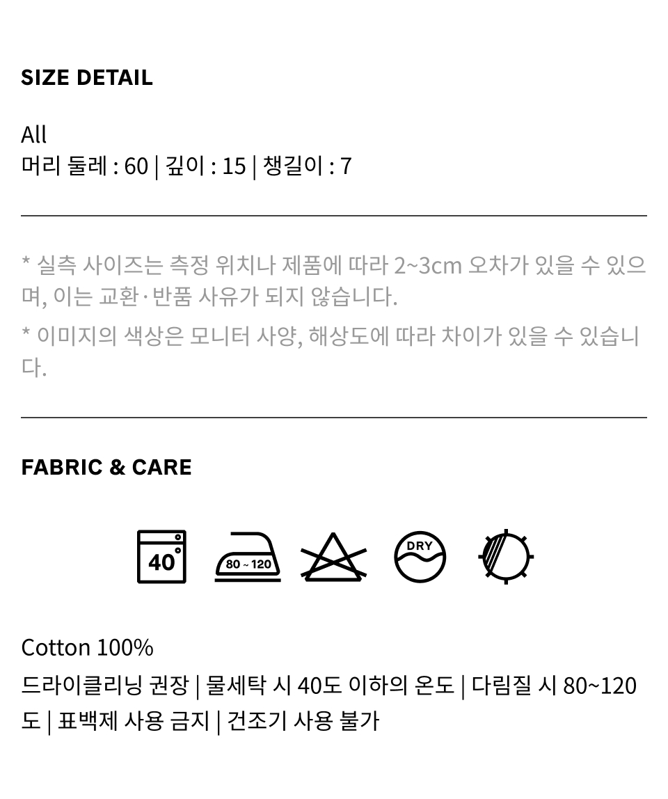 | 머리 둘레 | 깊이 | 챙길이 |