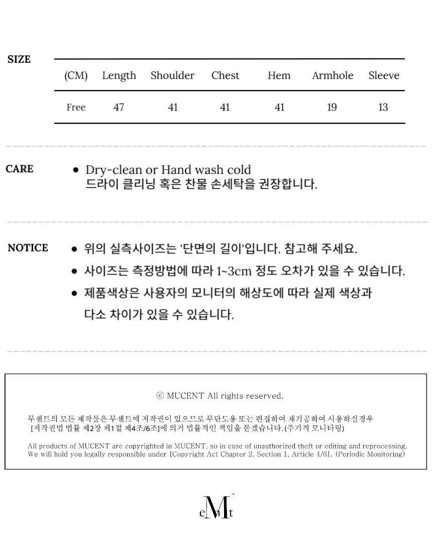 ┃Detail • 전면부 무센트 시그니처 로고 자수 • 보트넥 디자인 • 크롭한 기장감의 반팔 티 • 레귤러한 핏으로 편안한 착용감 • 부드러운 터치감의 코튼 원단 • 밑단 후드끈 디테일로 다양한 스타일링 가능 ┃Material : Cotton 100% ┃Care : Dry cleaning - 무센트는 말기의 행성인 이 지구에서 지속 가능한 옷들을 고민합니다. 우리는 신념을 소비하는 미닝아웃을 지지합니다.