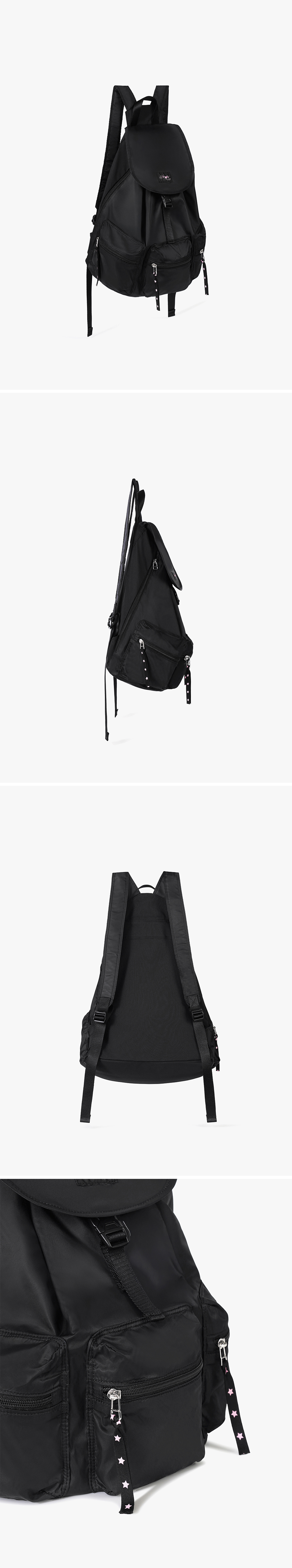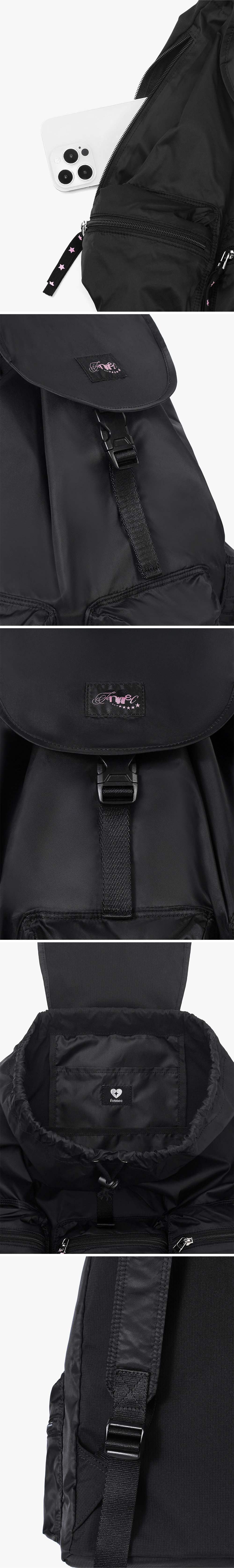 - 3개의 지퍼 포켓과 사이드 지퍼 디테일로 실용적인 백팩 - 별 스트링이 포인트 - 14인치 노트북 수납이 가능한 사이즈 - 외부 지퍼 포켓3, 내부 오픈 포켓 2 - 페넥 로고 라벨 디테일