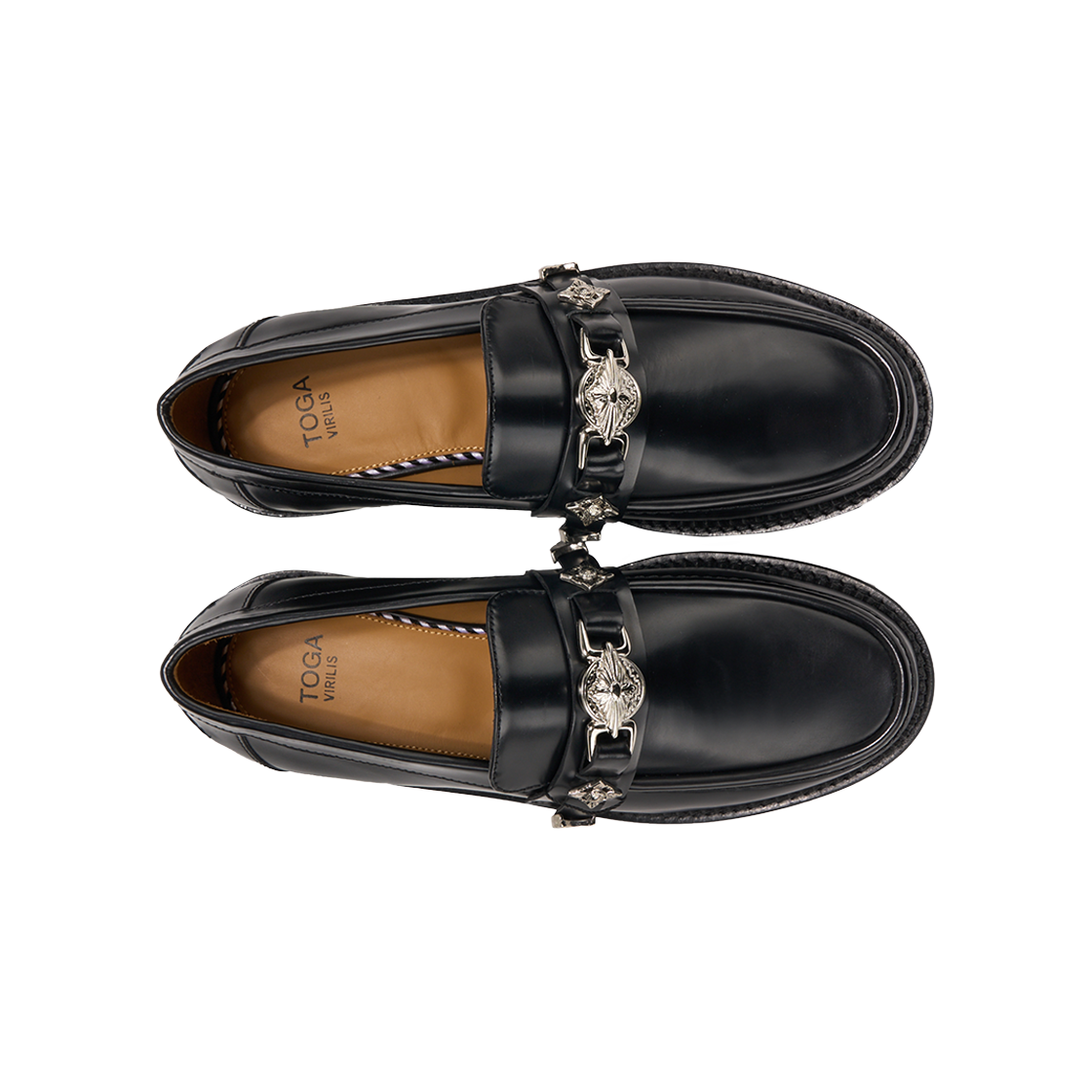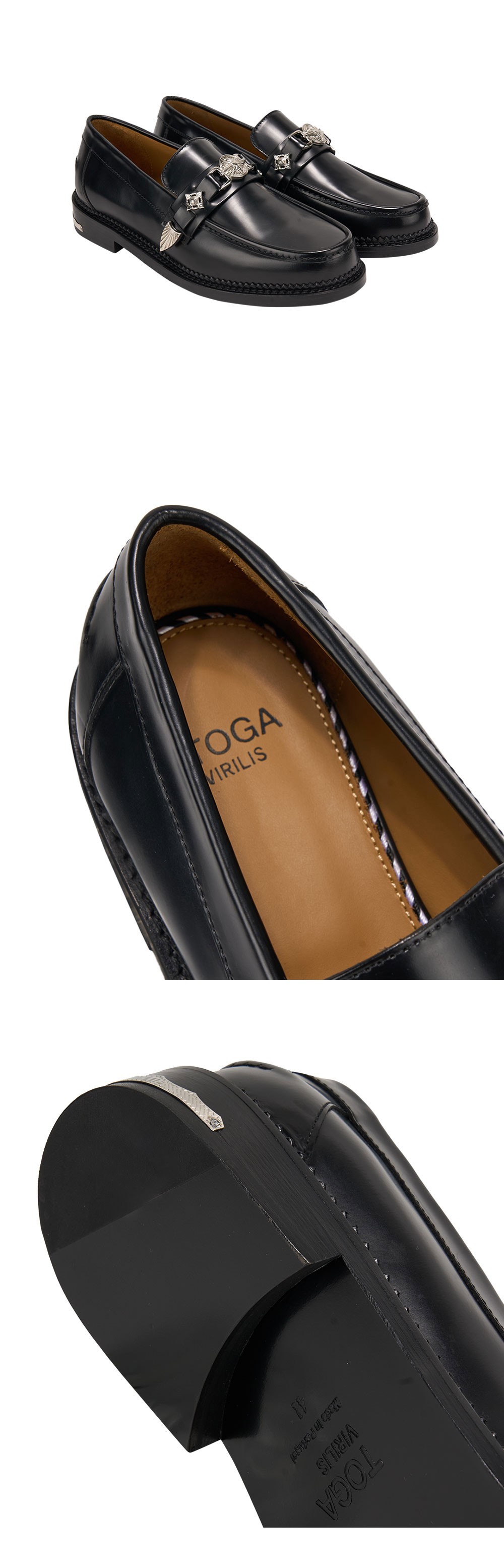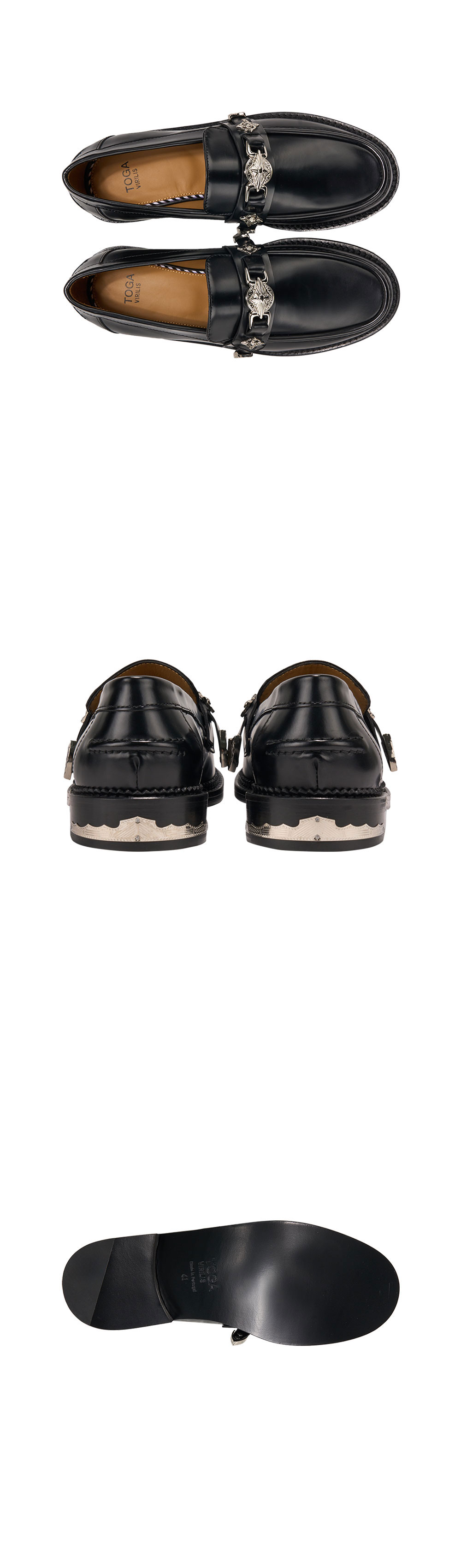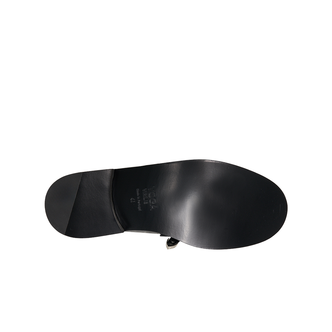 버클 금속 장식으로 존재감을 드러내는 토가의 비릴리스 AJ826 폴리도입니다. - 윤기가 있는 가죽 - 메탈 스터즈의 호스 비트조 벨트 부착 - 메탈 플레이트 디테일의 힐 - 힐 3cm