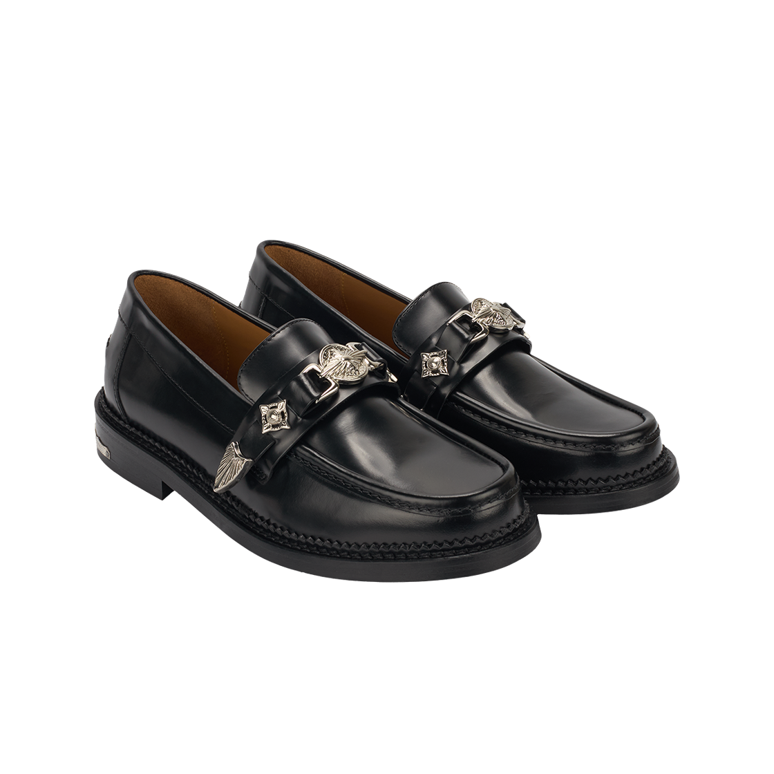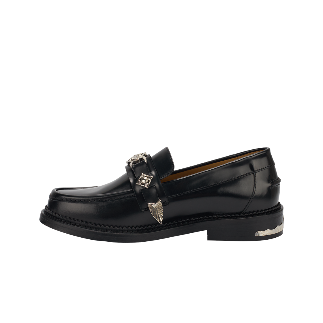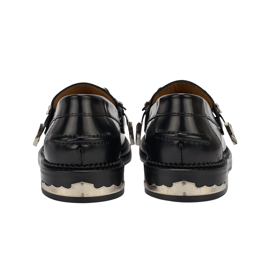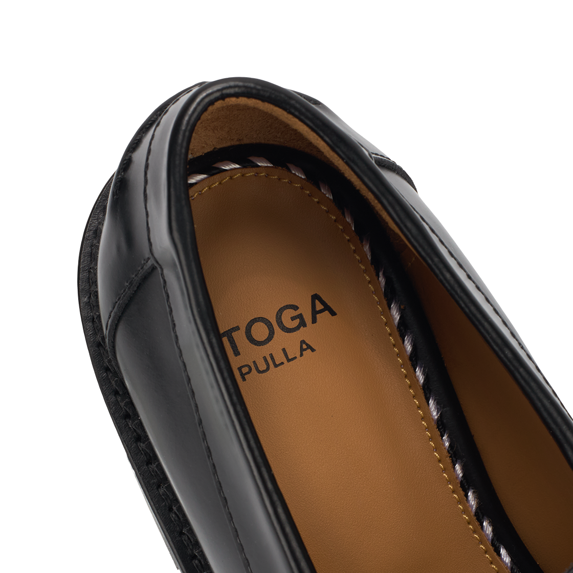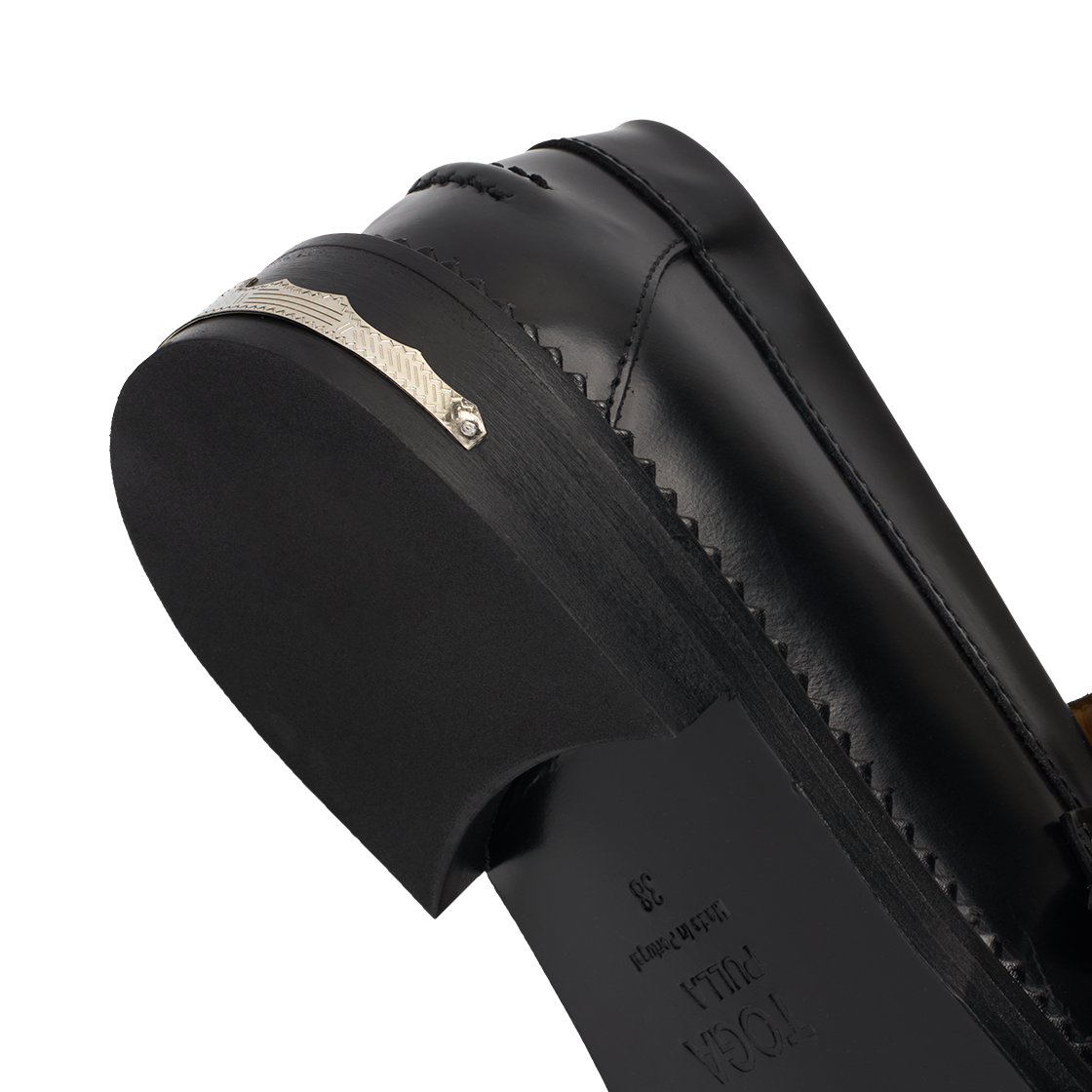 글로시한 레더와 메탈 스터드 디테일이 돋보적인 토가 풀라 AJ1041 블랙 컬러입니다. - 광택감 있는 가죽 - Horesbit 스타일의 금속 스터드 벨트 디자인 - 메탈 플레이트 디테일의 힐
