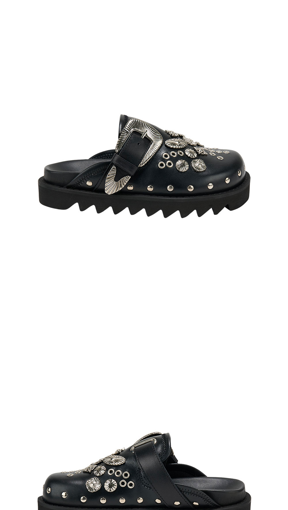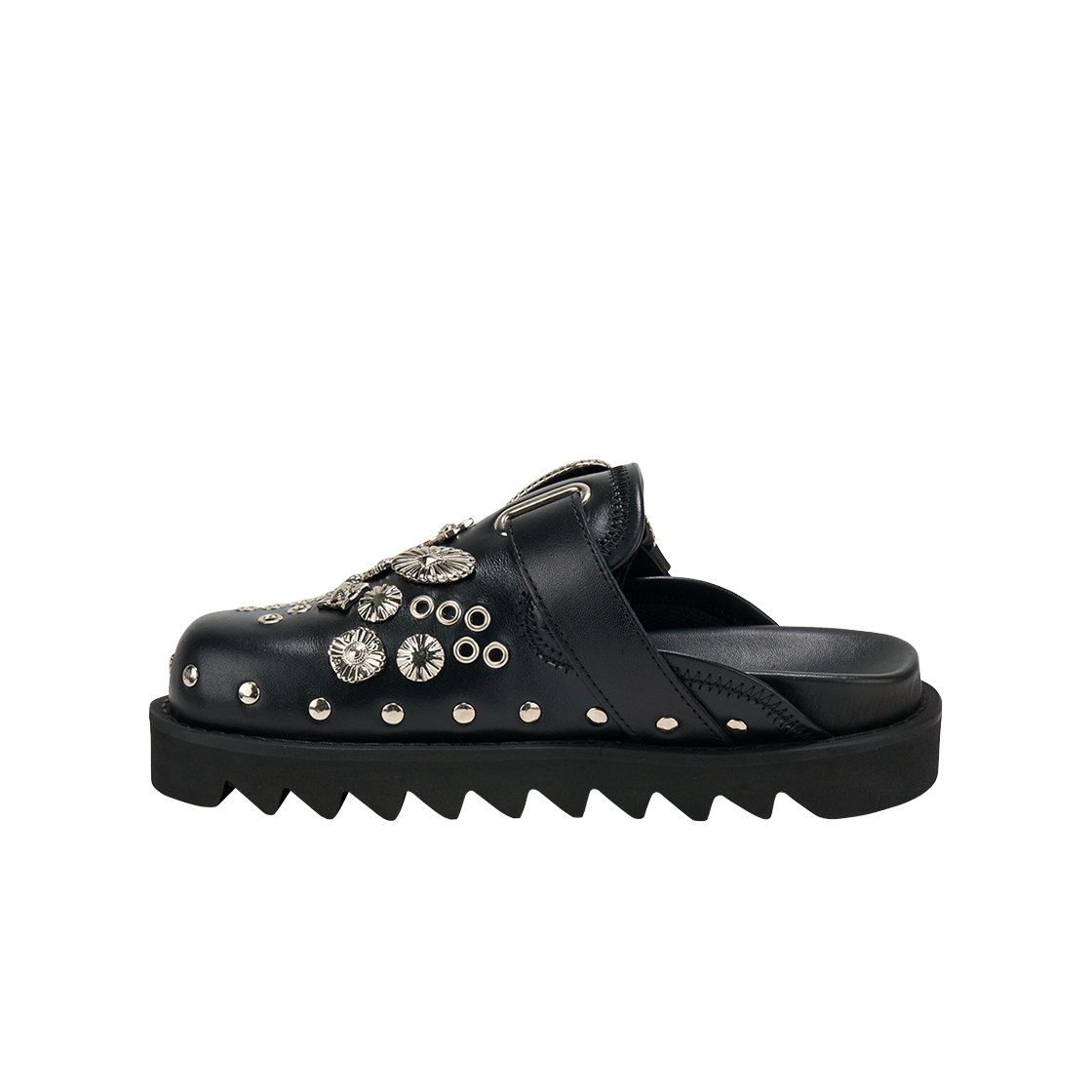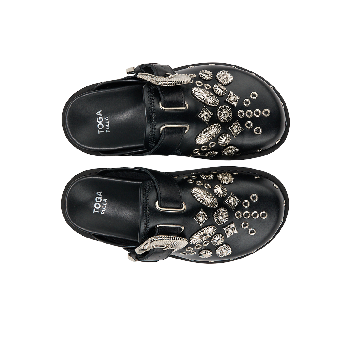 독보적인 메탈 스터드 디자인으로 존재감을 드러내는 토가의 풀라 AJ1058 레더입니다. - 어퍼 부분에 메탈 스터드, 메탈 아일렛 - 두께가 있는 샤크 솔 - 힐 2.5cm