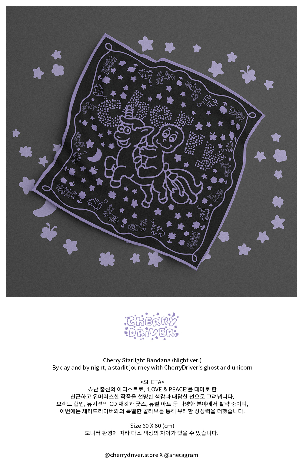 Cherry Starlight Bandana (Night ver.) By day and by night, a starlit journey with CherryDriver’s ghost and unicorn @cherrydriver.store X @shetagram <SHETA> 쇼난 출신의 아티스트로, ‘LOVE & PEACE’를 테마로 한 친근하고 유머러스한 작품을 선명한 색감과 대담한 선으로 그려냅니다. 브랜드 협업, 뮤지션의 CD 재킷과 굿즈, 뮤럴 아트 등 다양한 분야에서 활약 중이며, 이번에는 체리드라이버와의 특별한 콜라보를 통해 유쾌한 상상력을 더했습니다. Size 60 X 60 (cm) 모니터 환경에 따라 다소 색상의 차이가 있을 수 있습니다.