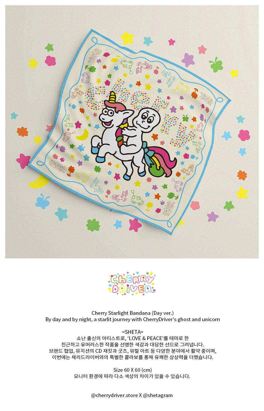 Cherry Starlight Bandana (Day ver.) By day and by night, a starlit journey with CherryDriver’s ghost and unicorn @cherrydriver.store X @shetagram <SHETA> 쇼난 출신의 아티스트로, ‘LOVE & PEACE’를 테마로 한 친근하고 유머러스한 작품을 선명한 색감과 대담한 선으로 그려냅니다. 브랜드 협업, 뮤지션의 CD 재킷과 굿즈, 뮤럴 아트 등 다양한 분야에서 활약 중이며, 이번에는 체리드라이버와의 특별한 콜라보를 통해 유쾌한 상상력을 더했습니다. Size 60 X 60 (cm) 모니터 환경에 따라 다소 색상의 차이가 있을 수 있습니다.