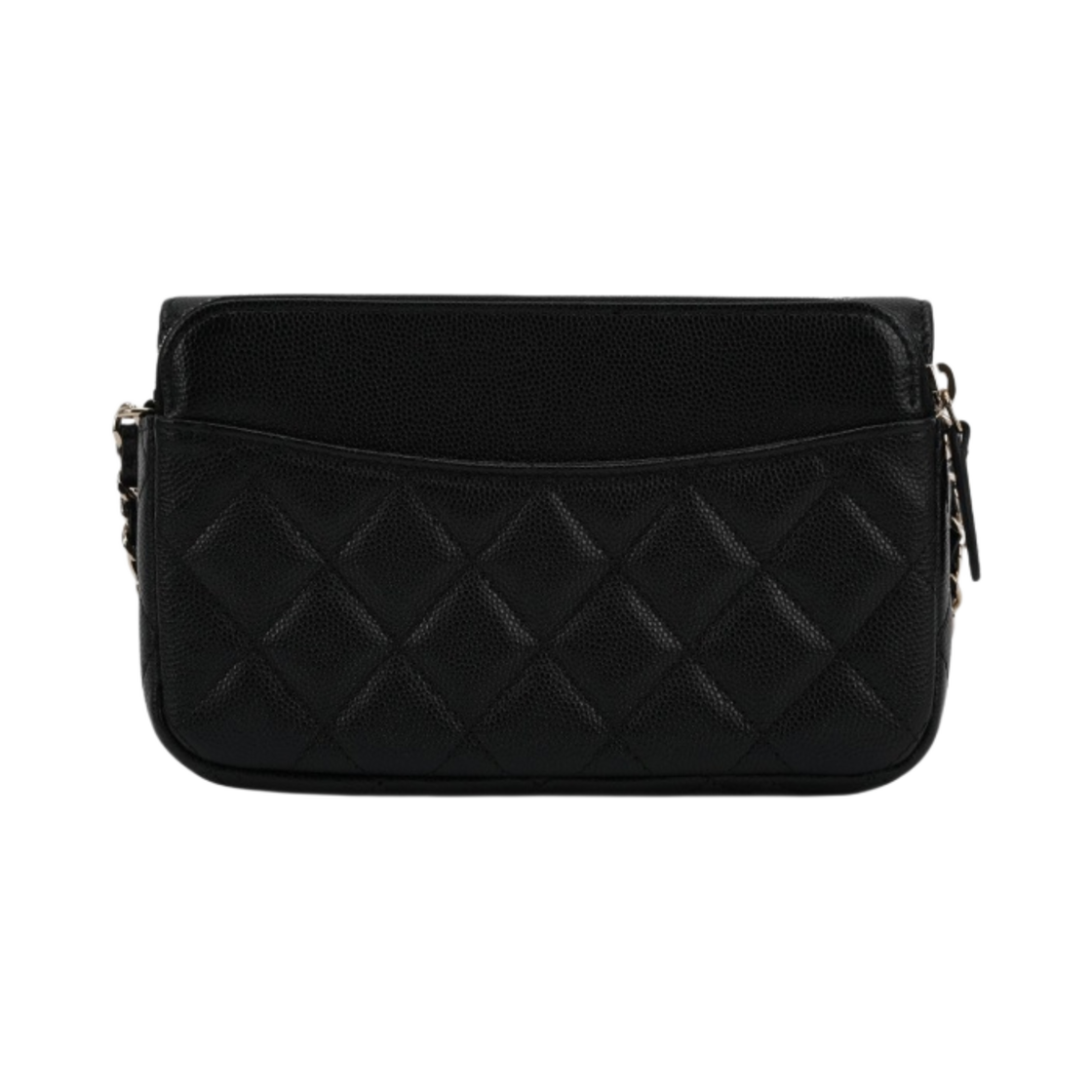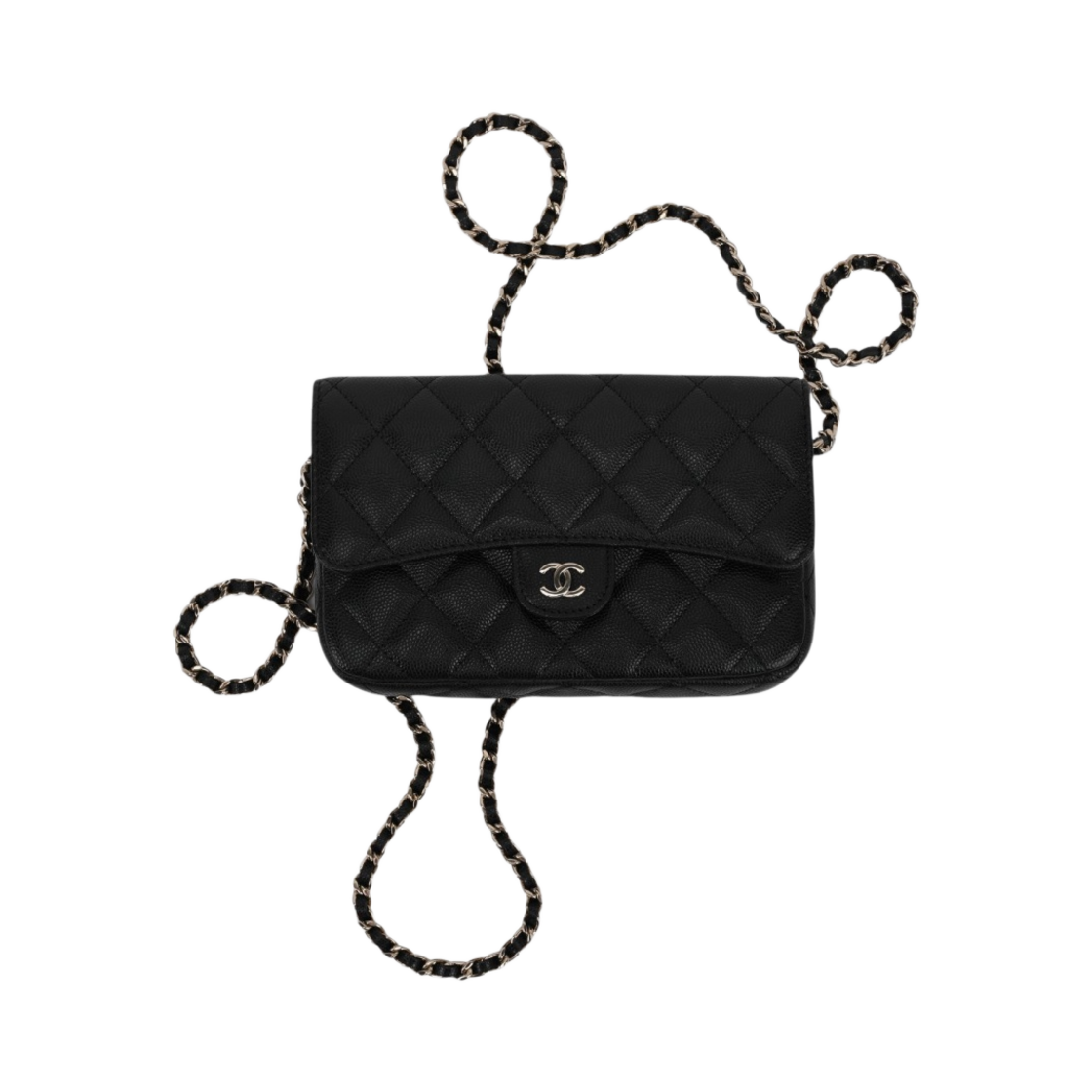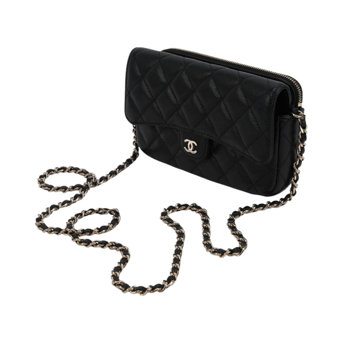 샤넬 클래식 체인 플랩 폰 홀더 그레인드 카프스킨 & 골드 메탈 블랙