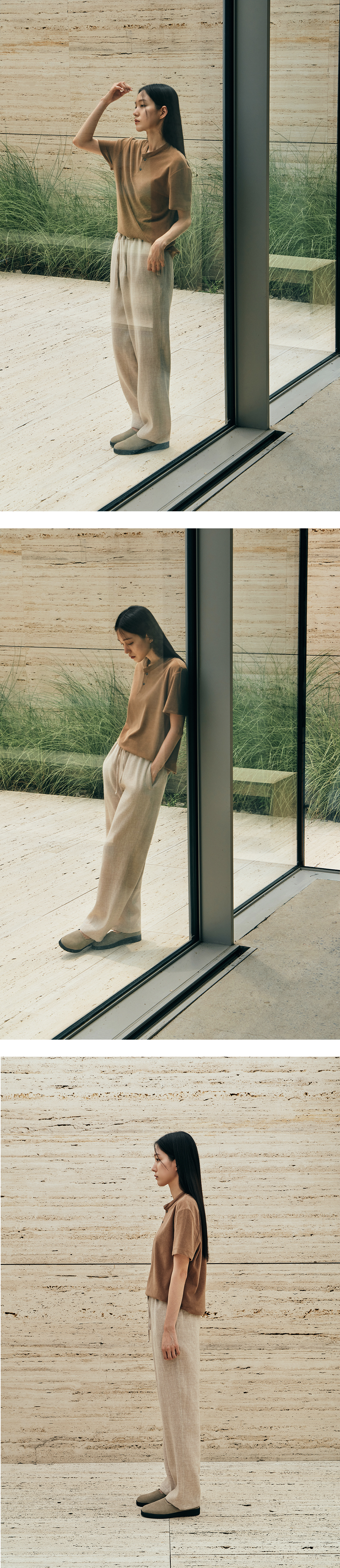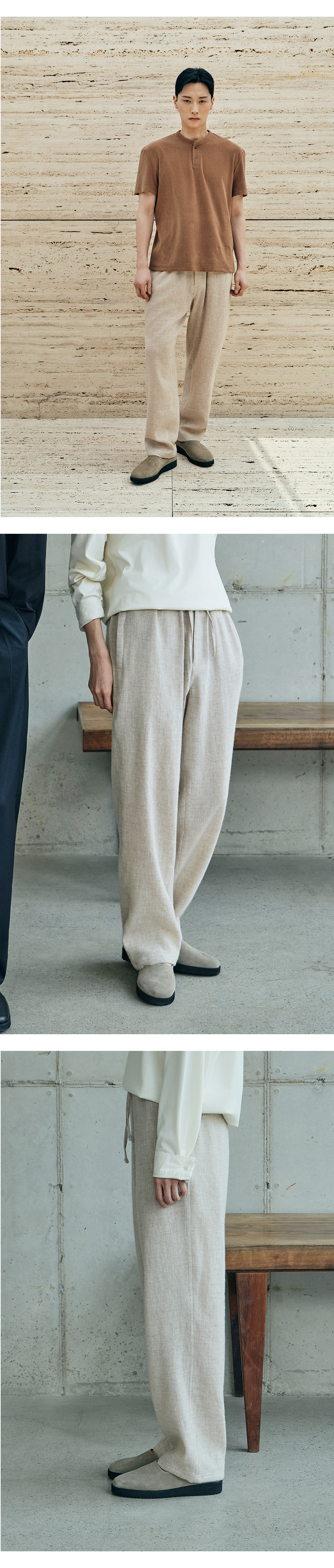 - MODEL : 181CM 67KG TOP -M BOTTOM - M - MODEL : 165CM 45KG TOP -W l XS BOTTOM - W l XS 우아한 실루엣으로 테일러링 된 테이퍼드 플리츠 패턴을 기반으로 제작. 여유있는 실루엣과 시원함-폭신함을 모두 느낄 수 있는 울-리넨 소재 사용. 최상급 유럽 원단에서 느껴지는 컬러 톤과 안정감이 일상에 여유와 편안함을 제공합니다.