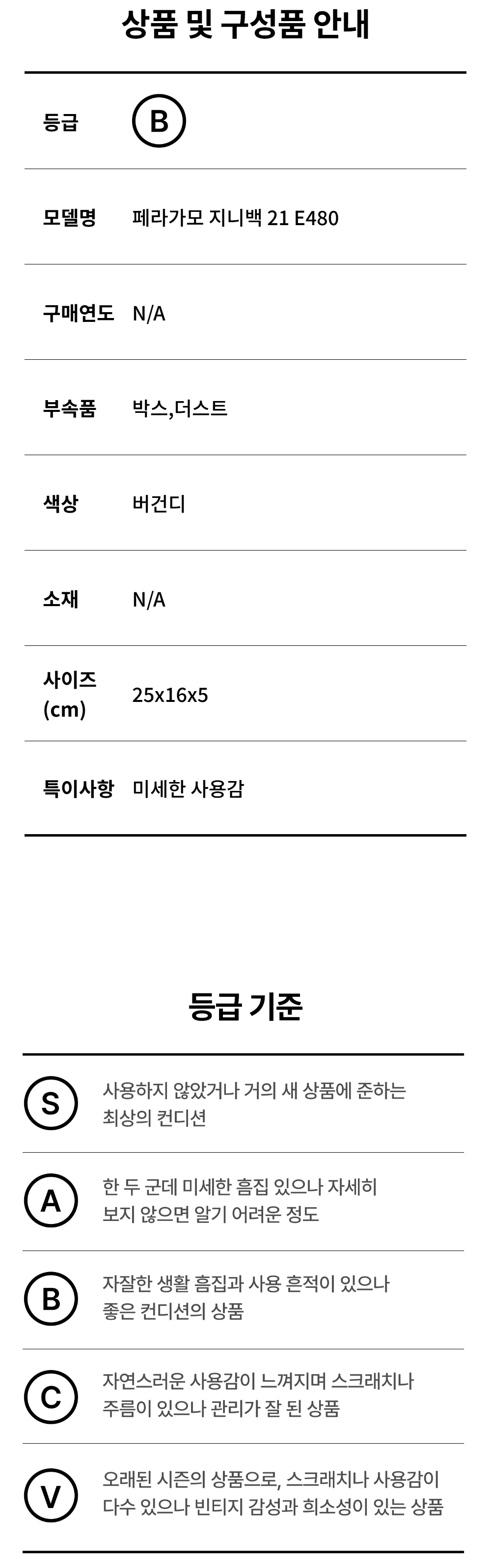 모든 상품(가죽, 의류, 잡화, 슈즈 등)은 사용자의 사용방법과 환경에 따라 변형, 변색이 될 수 있으니 반드시 취급 라벨에 표시된 관리 안내를 따르시길 권장 드립니다. 이는 정도의 차이가 있으며 과도한 체열과 땀, 습기, 빛, 마찰은 제품의 손상 및 변형을 일으킬 수 있으므로 주의하시길 바랍니다.