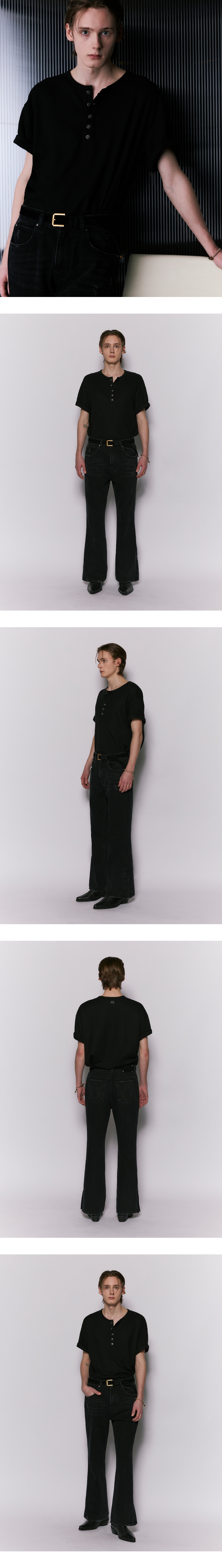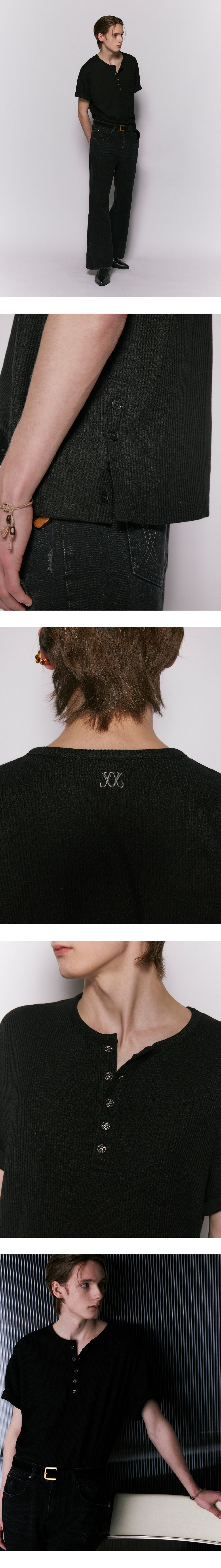 - 편안하게 착용 가능한 세미 오버사이즈 핏 - W 모양의 독특한 금속 버튼 헨리넥 디테일 - 탄탄하고 신축성 있는 골지 니트 소재 제작 - 등판 상단 웨슬리 휴스턴 로고 자수 포인트 - 양쪽 사이드 버튼 트임을 활용한 다양한 연출 - DRY CLEAN or WASH SEPARATELY