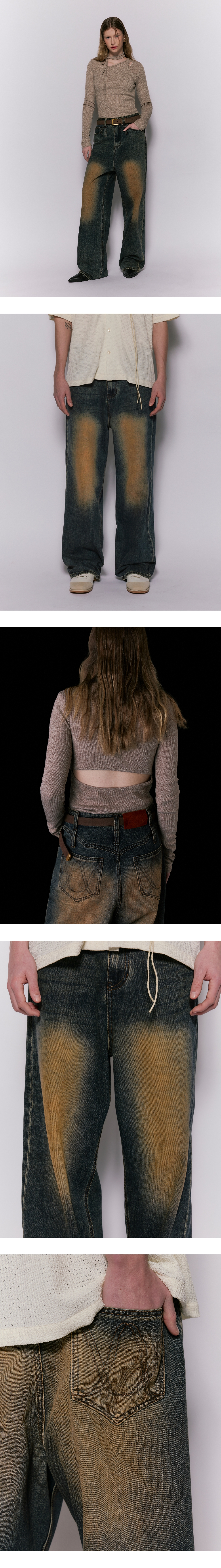 - 짙은 브라운 톤 워싱의 와이드 핏 롱 데님팬츠 - 벨트고리 2개가 세로로 이어져 있는 포인트 디자인 - 더블 벨트고리를 활용한 다양한 벨트 스타일링 연출 - 좌 & 우 양쪽 시계 포켓과 사이드심 벨트고리 디테일 - 뒤판 웨스턴 요크와 뒤 포켓 로고 자수 스티치 포인트 - 앤틱골드 컬러 로고 각인 금속 캔톤, 리벳 사용 - 웨슬리 휴스턴 로고 스웨이드 텍션지 마감 - DRY CLEAN or WASH SEPARATELY