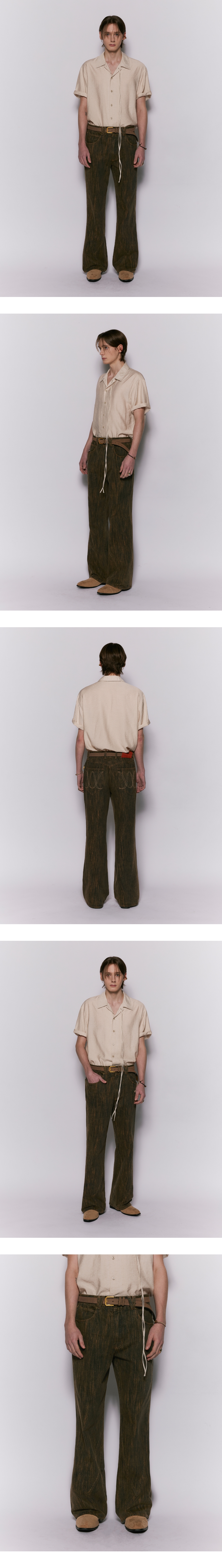 - 부츠컷 실루엣과 세로 결의 슬랍이 매력적인 데님 팬츠 - 진한 브라운 컬러 다잉 워싱과 인디고 컬러 베이스 슬랍 - 사이드심이 정면으로 돌아오는 커브드 심 라인 디자인 - 앞, 뒤 허릿단 V 벨트 고리와 뒤판 웨스턴 요크 디테일 - 뒤 포켓 웨슬리 휴스턴 로고 자수 스티치 포인트 - 앤틱골드 컬러 로고 각인 금속 캔톤, 리벳 사용 - 웨슬리 휴스턴 로고 스웨이드 텍션지 마감 - DRY CLEAN or WASH SEPARATELY