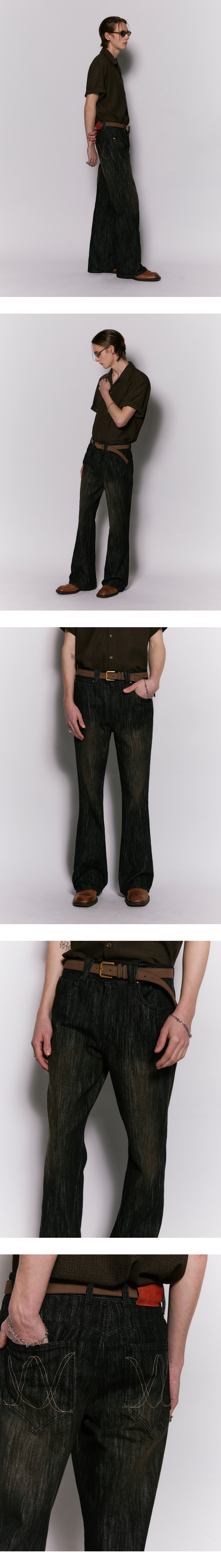 - 부츠컷 실루엣과 세로 결의 슬랍이 매력적인 데님 팬츠 - 은은한 브라운 컬러 브러쉬 워싱과 블랙 베이스 슬랍 - 사이드심이 정면으로 돌아오는 커브드 심 라인 디자인 - 앞, 뒤 허릿단 V 벨트 고리와 뒤판 웨스턴 요크 디테일 - 뒤 포켓 웨슬리 휴스턴 로고 자수 스티치 포인트 - 앤틱골드 컬러 로고 각인 금속 캔톤, 리벳 사용 - 웨슬리 휴스턴 로고 스웨이드 텍션지 마감 - DRY CLEAN or WASH SEPARATELY