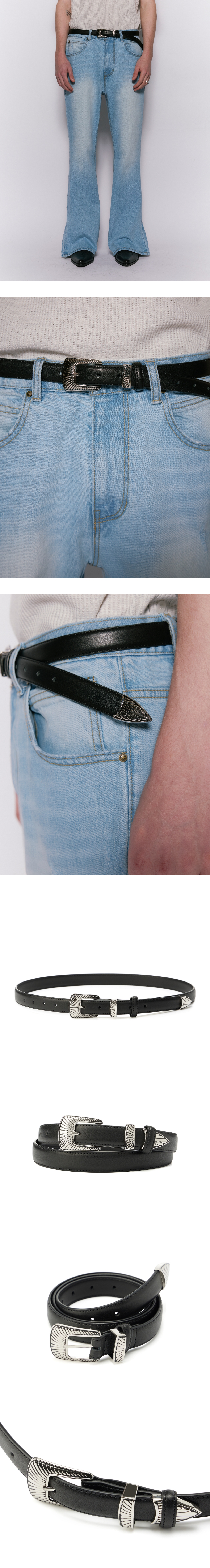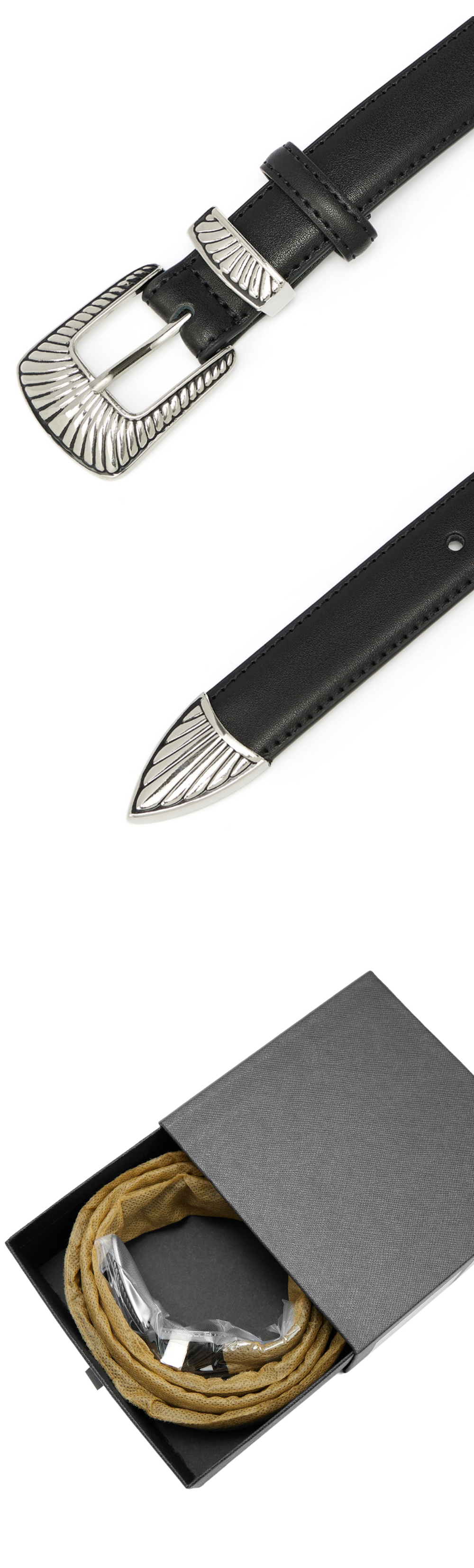 - 과하지 않은 은은한 웨스턴 무드의 소가죽 벨트 - 강한 내구성의 100% 소가죽으로 제작하여 변형 최소화 - 10개의 벨트구멍으로 1인치 단위의 허리 사이즈 조절 - 은은하고 고급스러운 흑니켈 컬러의 금속 버클, 끝 팁 사용 - 캐쥬얼한 데님부터 슬랙스까지 다양한 스타일링에 포인트