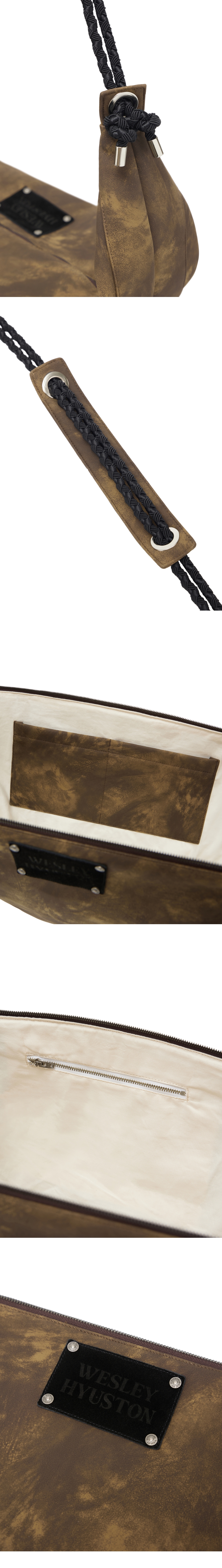 - 특수 가공 처리된 에코 레더 소재로 제작 - 은은한 크랙과 부드러운 촉감이 특징적인 크로스백 - 독특한 꼬임 패턴의 굵은 스트링 어깨끈 - 니켈 컬러의 금속 아일렛, O링, 끝 팁 부자재 - 가방 내부 고급스럽고 탄탄한 아이보리 코튼 안감 - 내부 오픈형 레더 포켓, 반대편 YKK 지퍼 포켓 디테일 - 웨슬리 휴스턴 스웨이드 텍션지, 흑니켈 리벳 마감 - DRY CLEAN ONLY