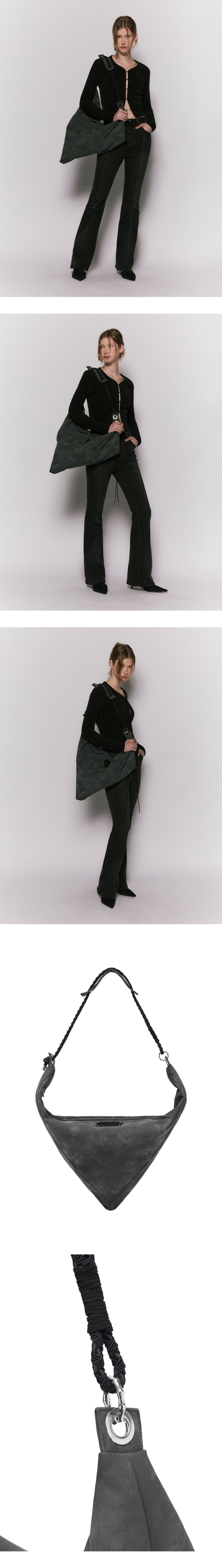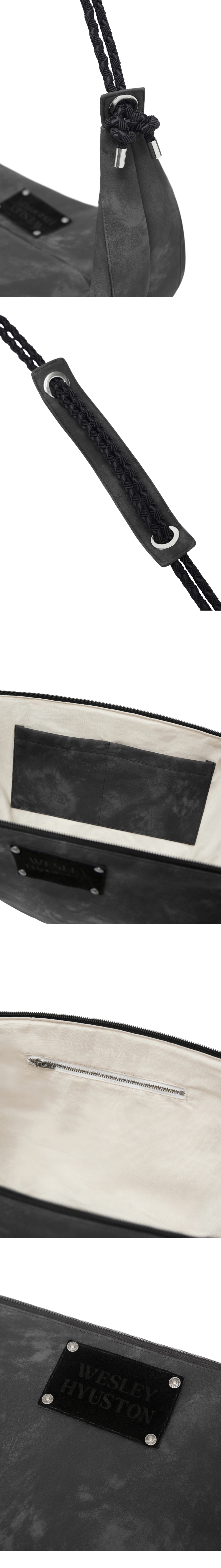 - 특수 가공 처리된 에코 레더 소재로 제작 - 은은한 크랙과 부드러운 촉감이 특징적인 크로스백 - 독특한 꼬임 패턴의 굵은 스트링 어깨끈 - 니켈 컬러의 금속 아일렛, O링, 끝 팁 부자재 - 가방 내부 고급스럽고 탄탄한 아이보리 코튼 안감 - 내부 오픈형 레더 포켓, 반대편 YKK 지퍼 포켓 디테일 - 웨슬리 휴스턴 스웨이드 텍션지, 흑니켈 리벳 마감 - DRY CLEAN ONLY