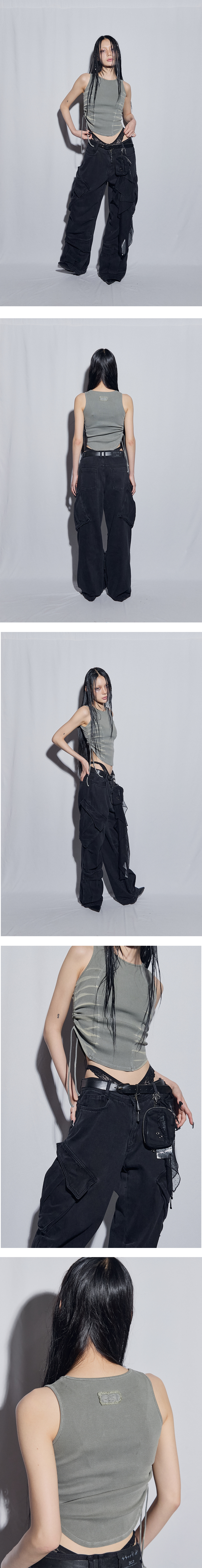 인체 곡선에 맞춘 전면 절개 디테일이 자연스러운 실루엣을 만들어주며, 라인을 따라 들어간 캣워싱 디테일이 독특한 텍스처와 스타일을 더합니다. 핏 조절이 가능한 스트랩 디테일은 착용자의 체형에 맞춰 편안한 착용감을 제공하며, 디자인과 기능을 모두 갖춘 제품입니다.