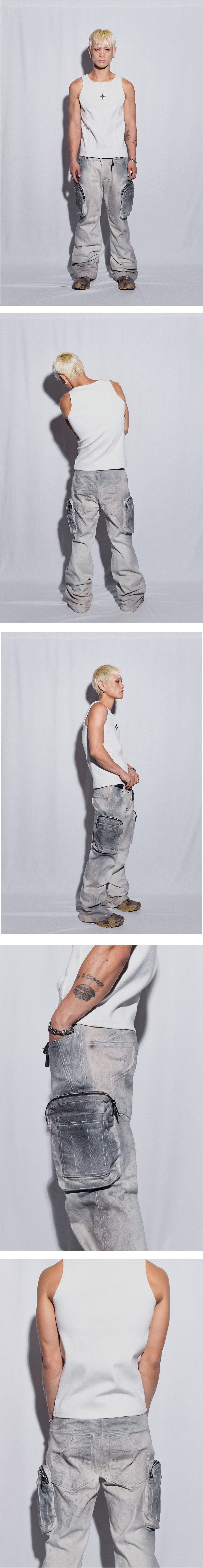 양측에 입체 지퍼 포켓 디테일이 더해져 수납이 용이하며, 핸드워싱 처리로 기성품과 차별화된 질감을 느낄 수 있습니다. 적당한 너비감의 플레어 팬츠 디자인으로 부담 없이 착용할 수 있고, YKK사의 바지 지퍼와 BLR 시그니처 캔톤이 사용되어 내구성과 완성도를 높였습니다.
