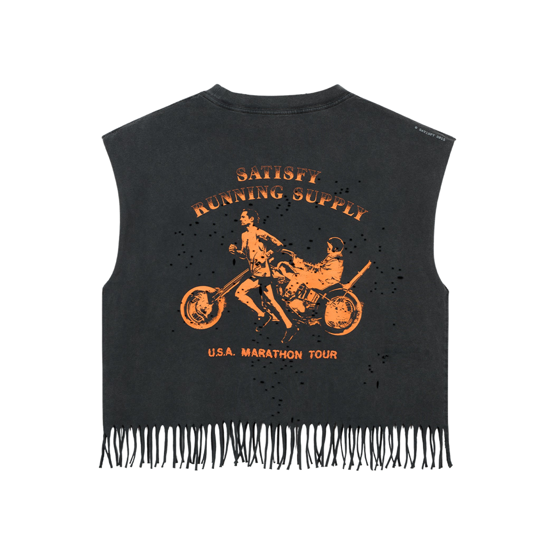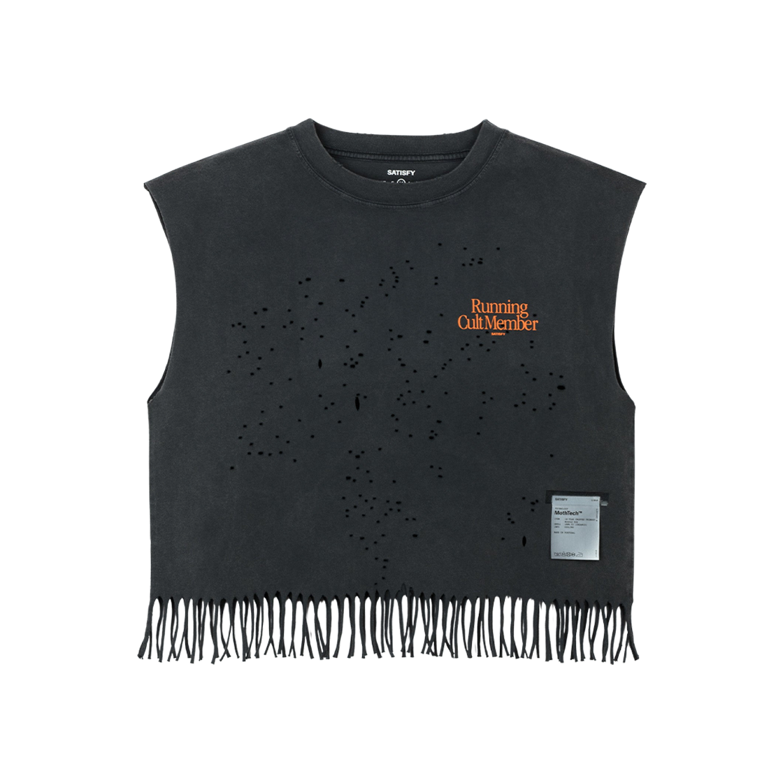 Satisfy 10th Anniversary Mothtech Cropped Fringed Muscle T-Shirt Aged Black