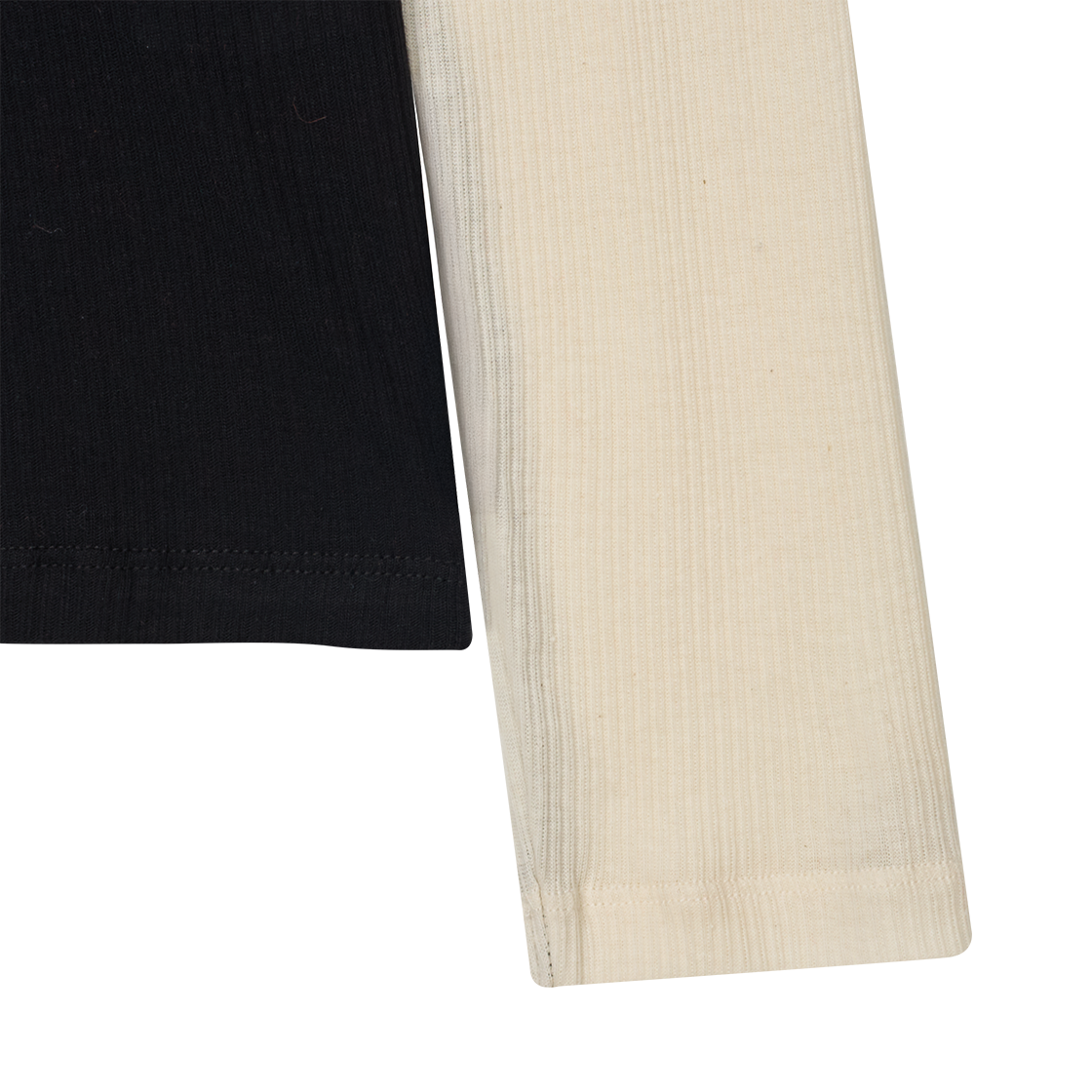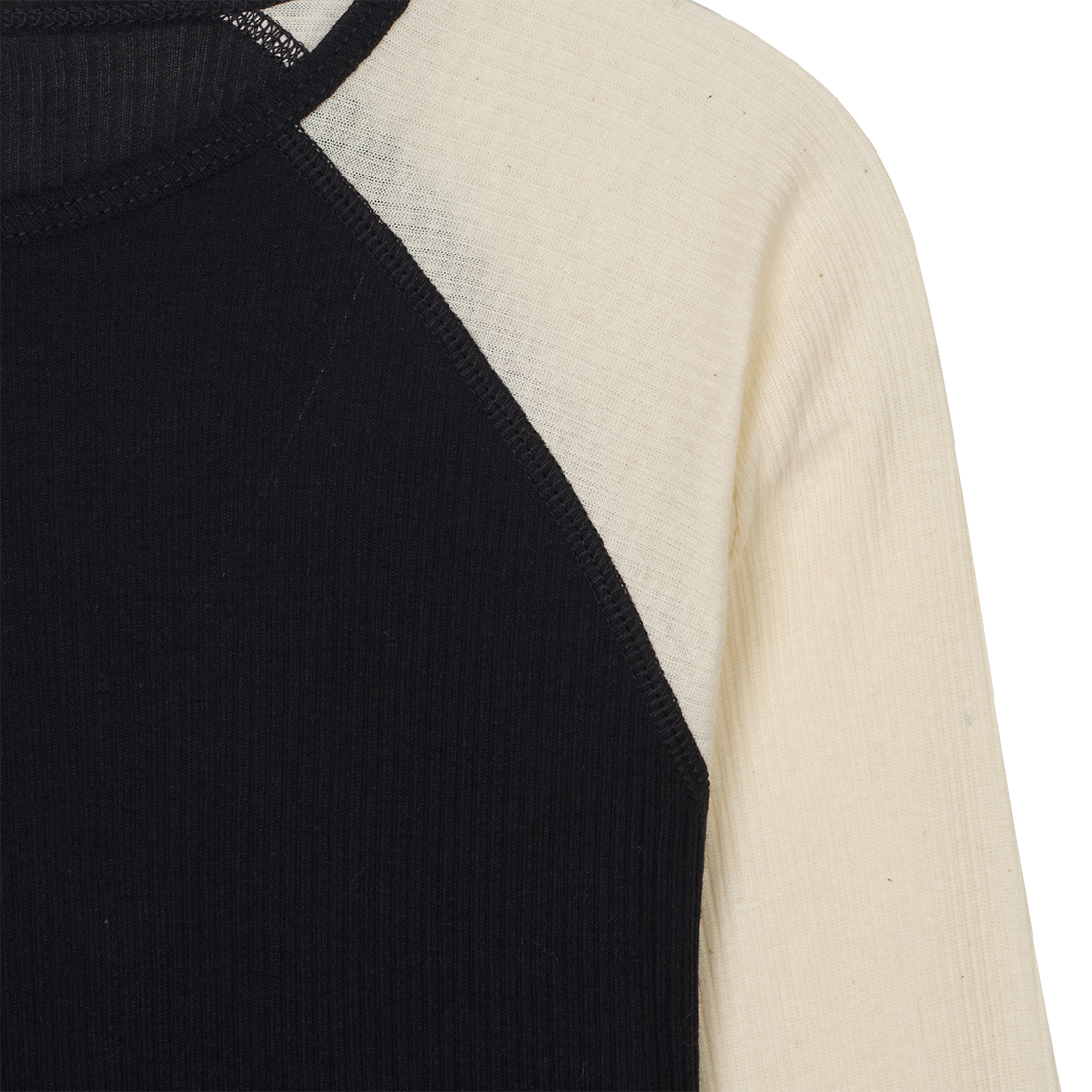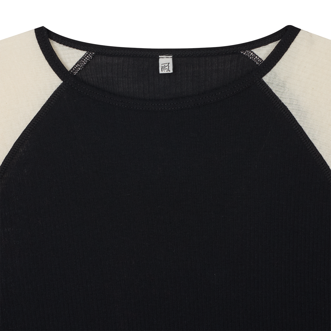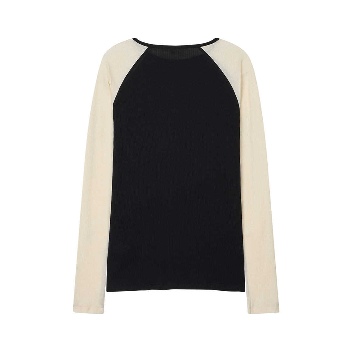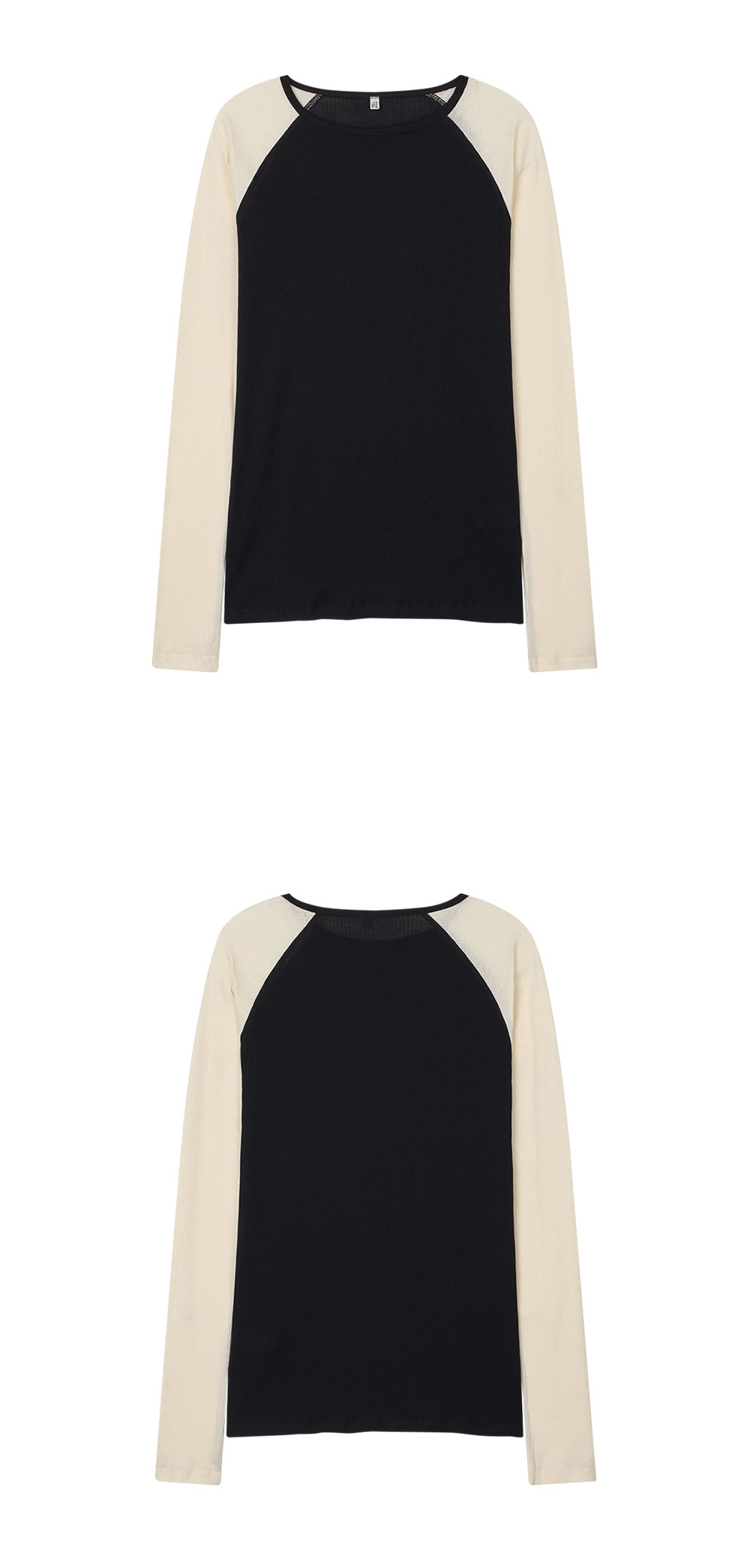 몸통과 소매 컬러 베리에이션이 매력적인 베이스레인지 진 롱 슬리브 티 블랙 컬러입니다. -오가닉 코튼 립 롱 슬리브 -크루넥 디자인 -래글런 롱 슬리브