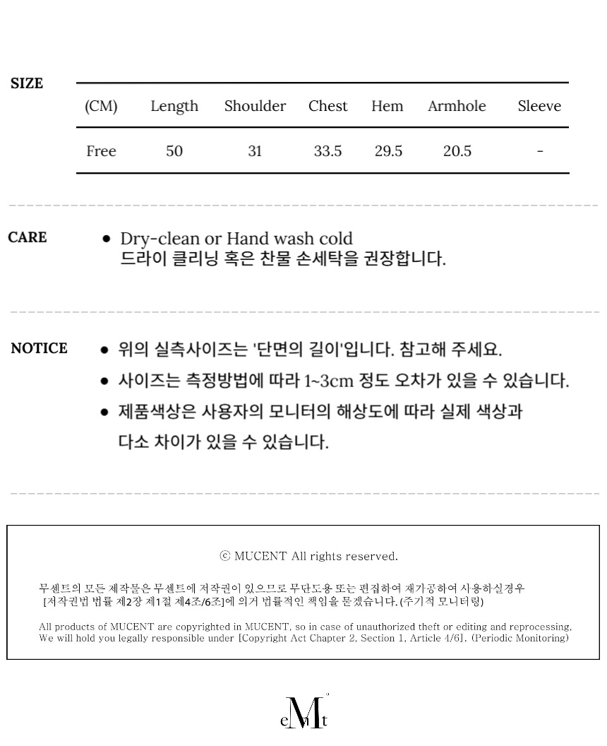 ┃Detail • 무센트 시그니처 메탈 로고 포인트 • 리벳 포인트와 절개 디테일로 유니크함 연출 • • 단품 착용시에도 부담없는 넥라인, 암홀라인 • 착용 시 피부에 부드럽게 밀착되는 터치감 • 단품, 이너로 모두 활용가능한 데일리 아이템 ┃Material : Cotton 100% ┃Care : Dry cleaning - 무센트는 말기의 행성인 이 지구에서 지속 가능한 옷들을 고민합니다. 우리는 신념을 소비하는 미닝아웃을 지지합니다.