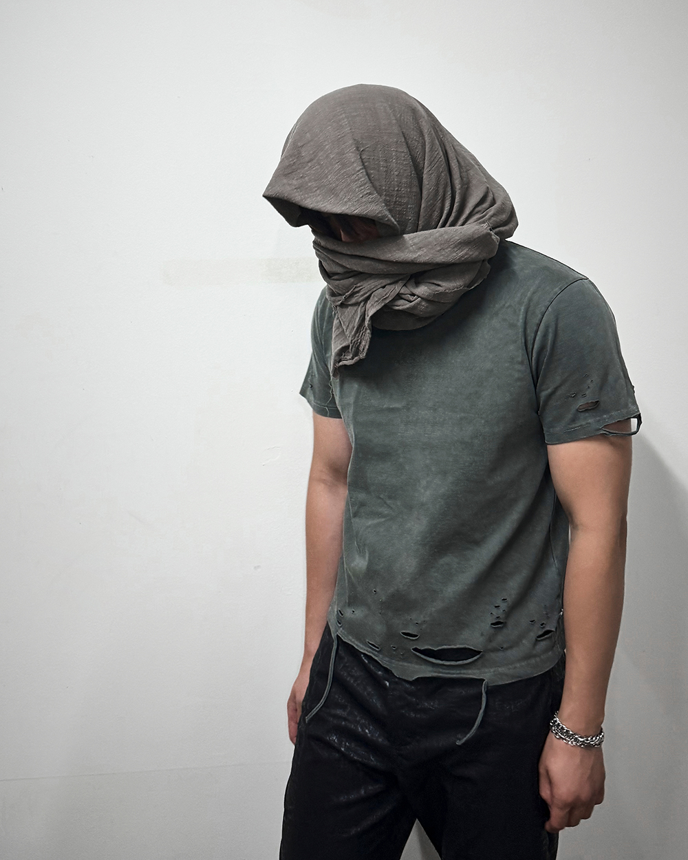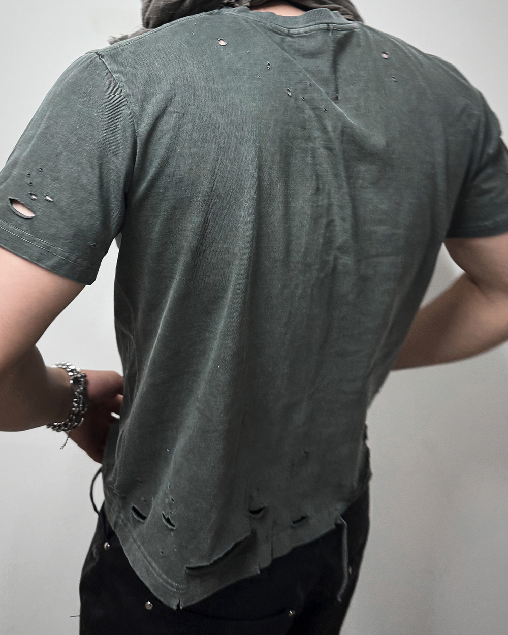 SHXDW 25SS ASHED DAMAGE T-SHIRT KHAKI 쉐도우 애쉬드 데미지 티셔츠 카키 DETAIL - FREE SIZE - CROP FIT - GARMENT DYEING - CUT OUT DAMAGE DETAIL