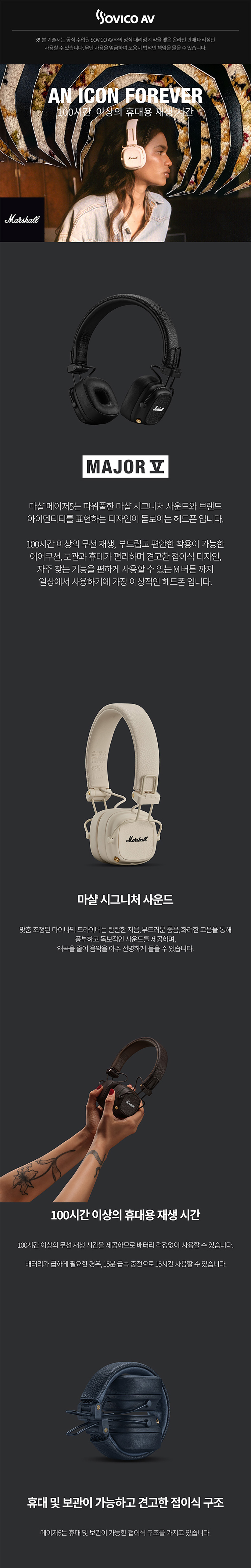 Major V는 파워풀한 마샬 시그니처 사운드와 브랜드 아이덴티티를 표현하는 디자인이 돋보이는 헤드폰이며 100시간 이상의 무선 재생, 부드럽고 편안한 착용이 가능한 일상에서 사용하기에 가장 이상적인 헤드폰 입니다.