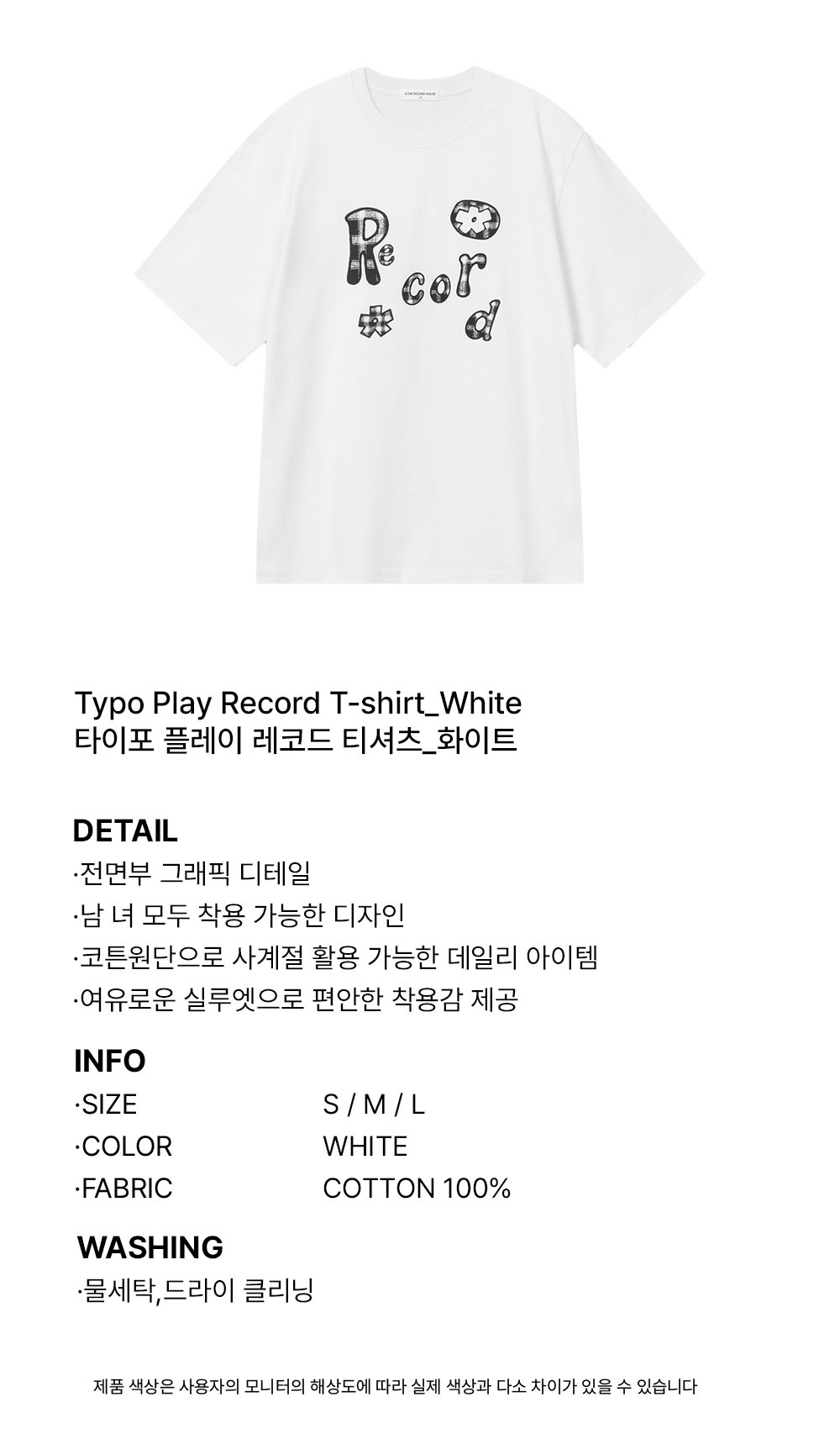 슬로우 레코드 하우스 타이포 플레이 레코드 티셔츠 화이트