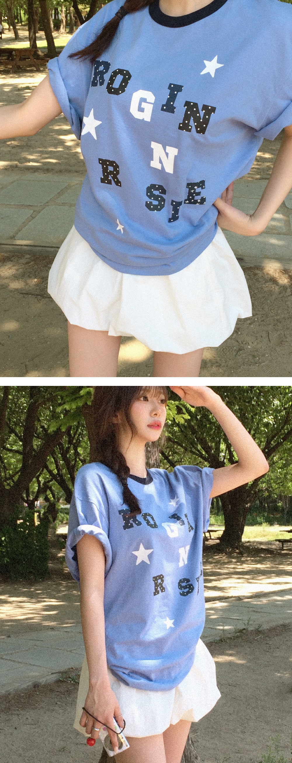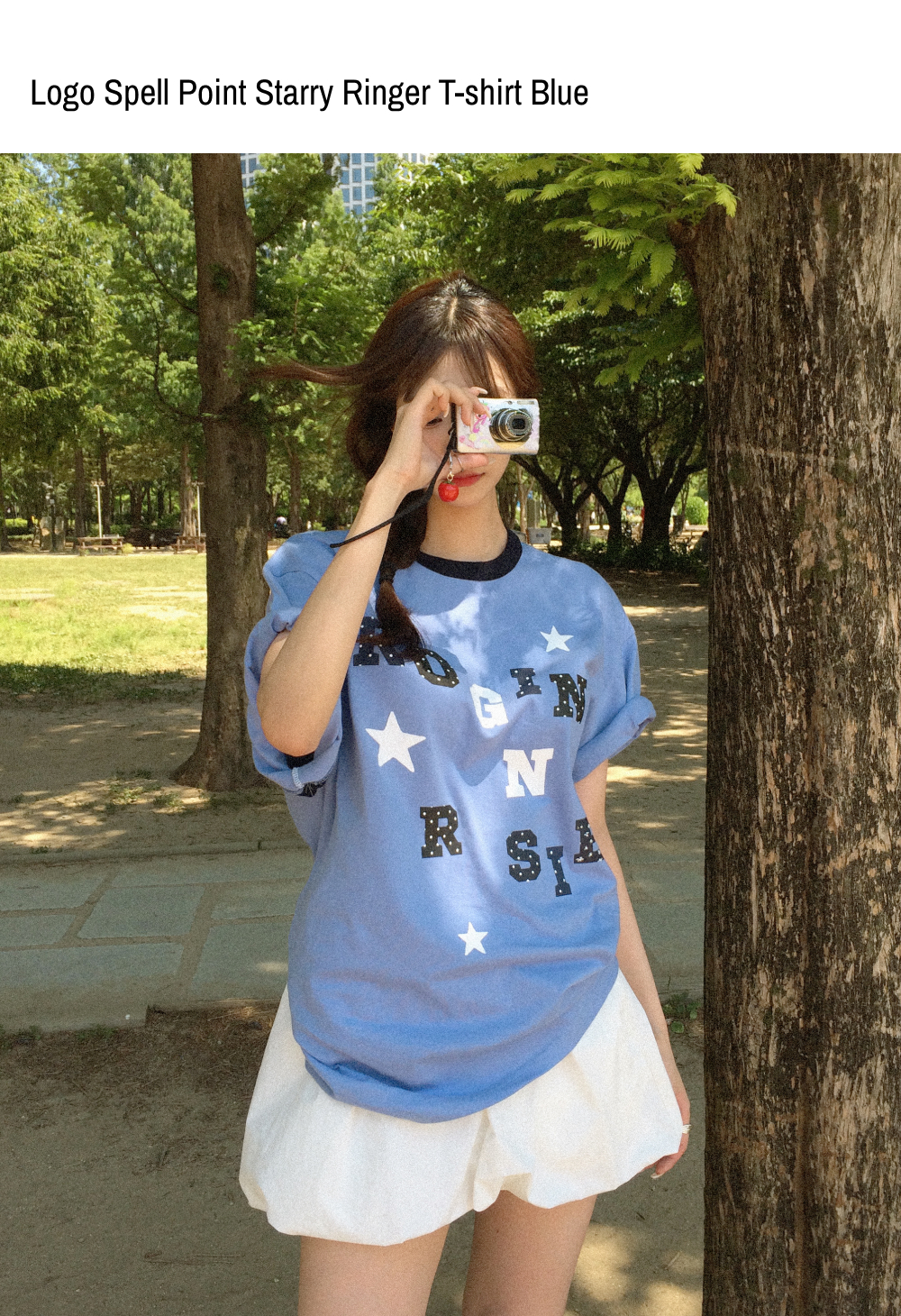 Rogin N Rosie Logo Spell Point Starry Ringer T-shirt Blue