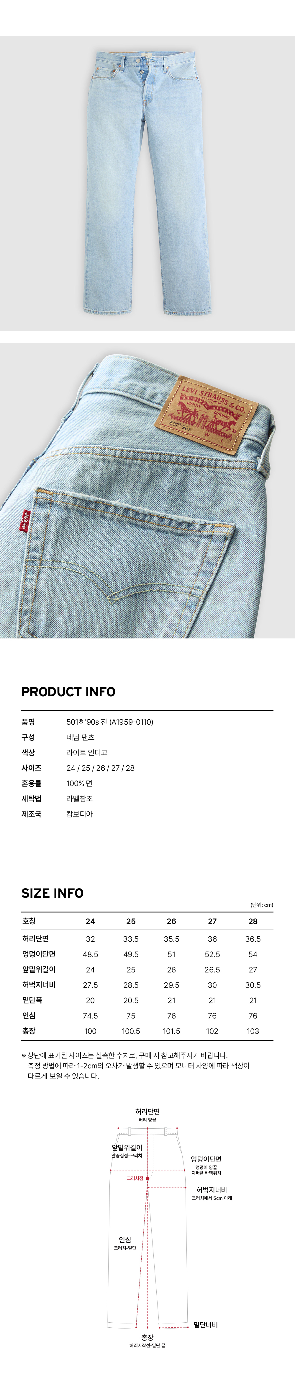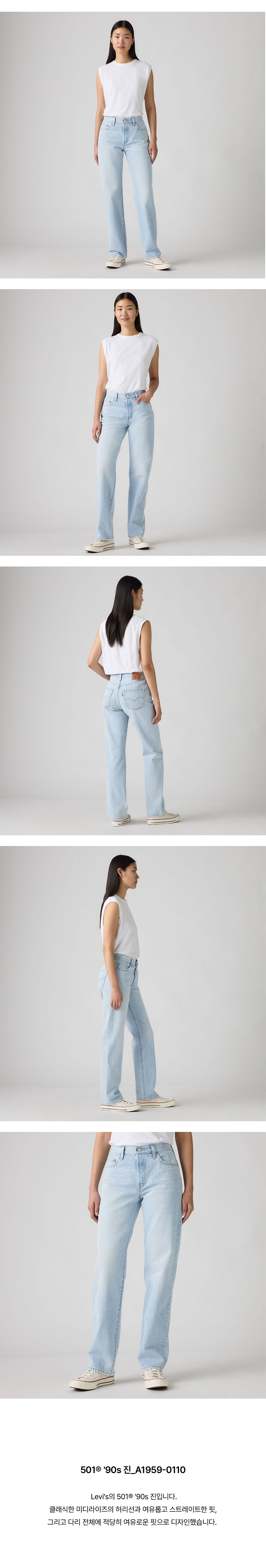 Levi's의 501® '90s 진입니다. 클래식한 미디라이즈의 허리선과 여유롭고 스트레이트한 핏, 그리고 다리 전체에 적당히 여유로운 핏으로 디자인했습니다.