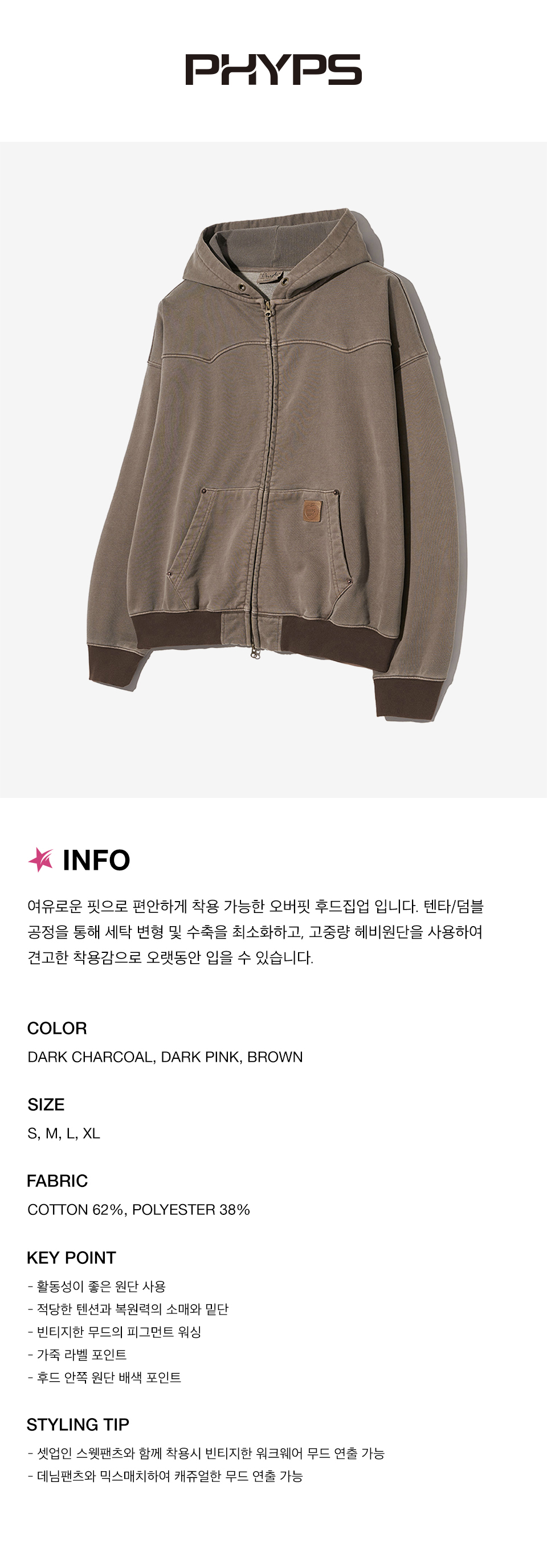 피지컬 디파트먼트 피그먼트 워싱 워크 후드집업 브라운