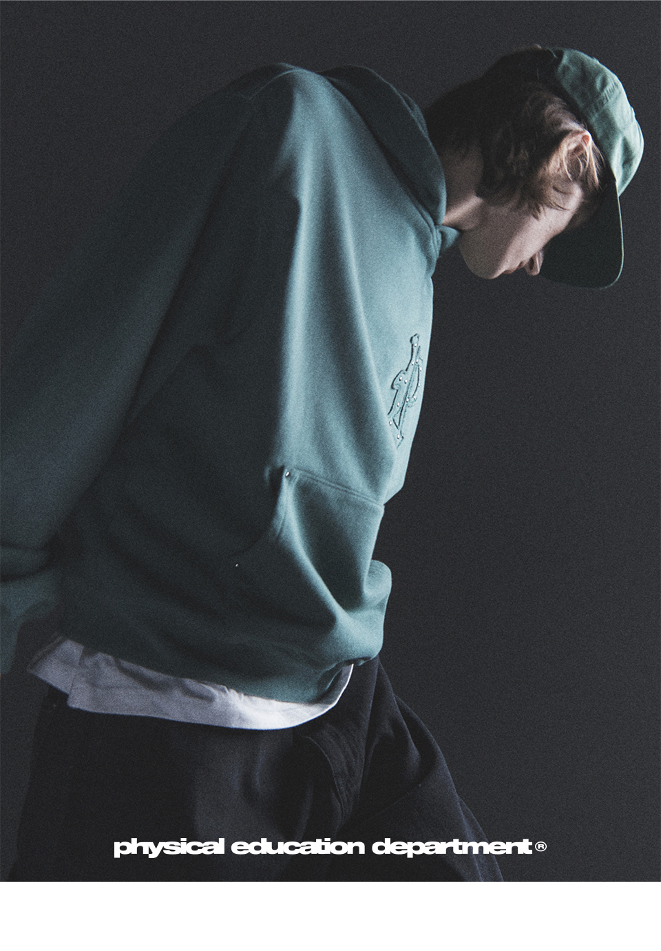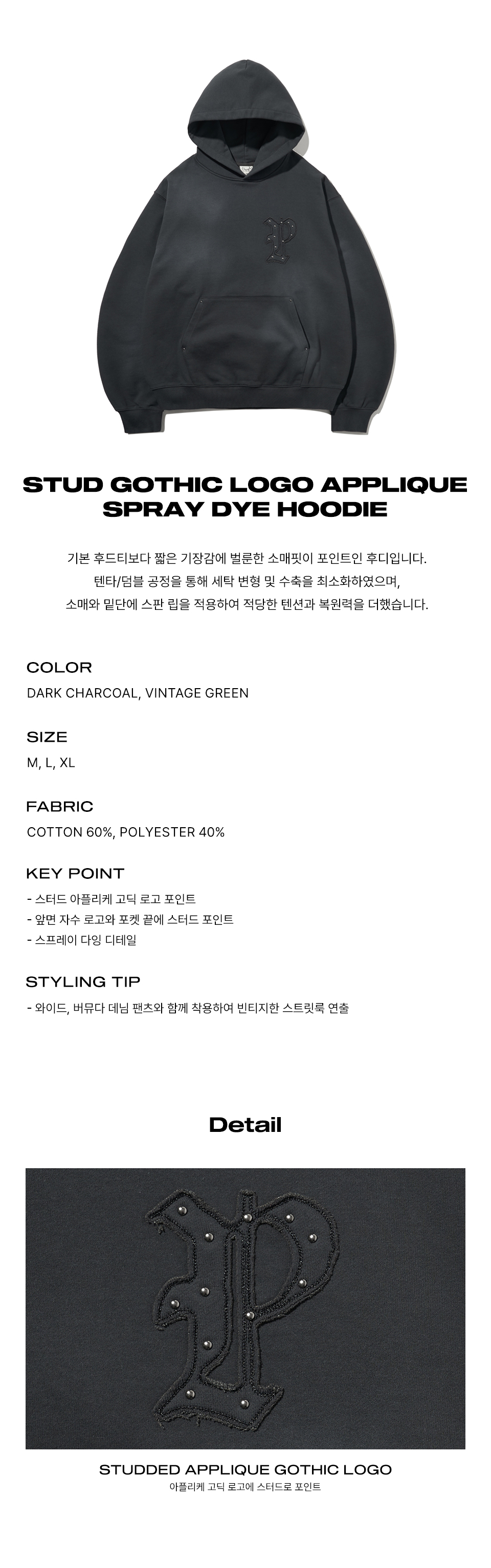 피지컬 디파트먼트 스터드 고딕 로고 아플리케 스프레이 다잉 후드 다크 차콜
