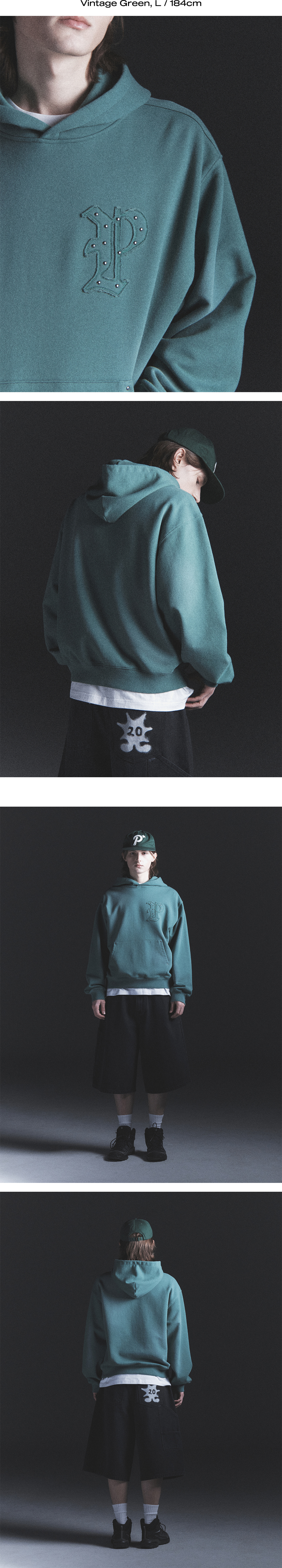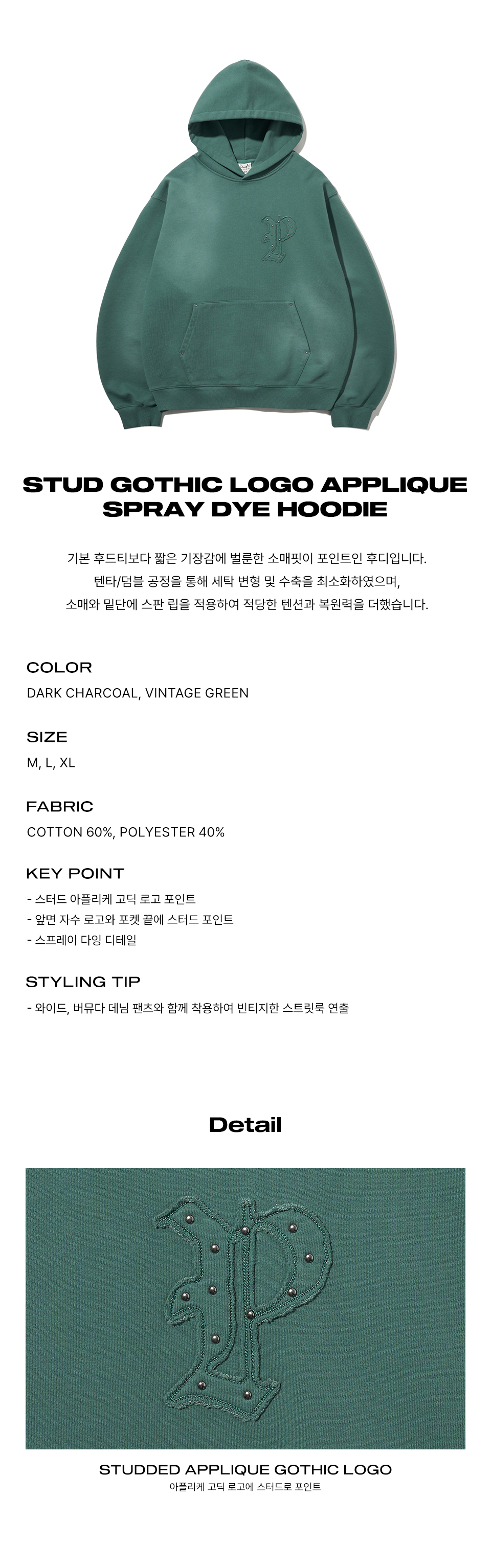피지컬 디파트먼트 스터드 고딕 로고 아플리케 스프레이 다잉 후드 빈티지 그린