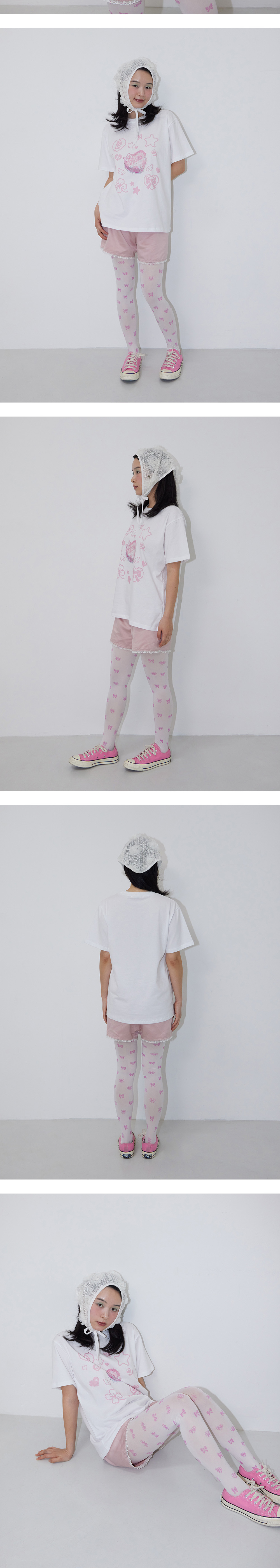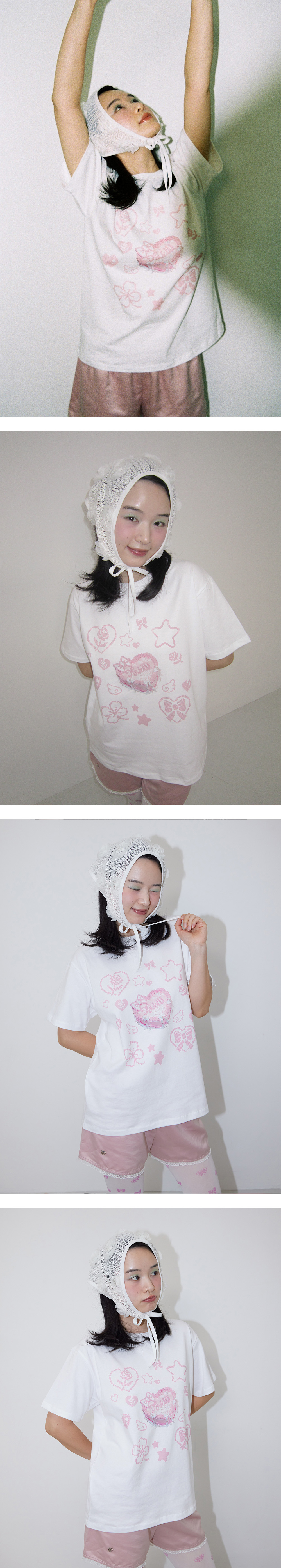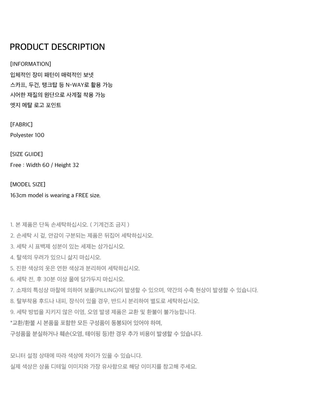입체적인 장미 패턴이 매력적인 보넷, 스카프, 두건, 탱크탑 등 N-Way로 활용 가능, 시어한 재질의 원단으로 사계절 착용 가능, 엣지 메탈 로고 포인트