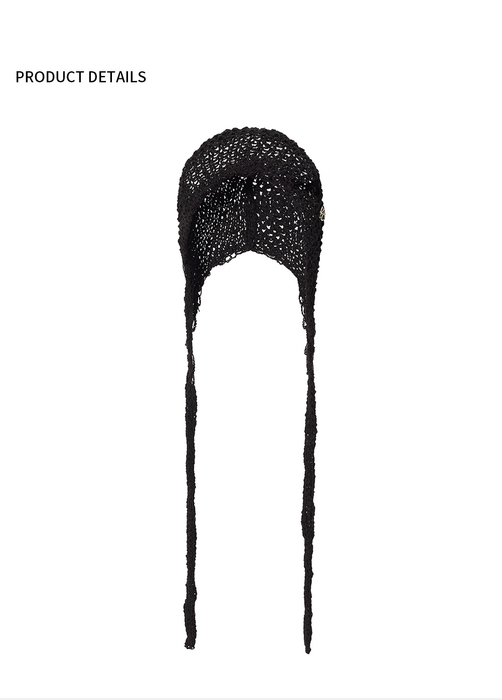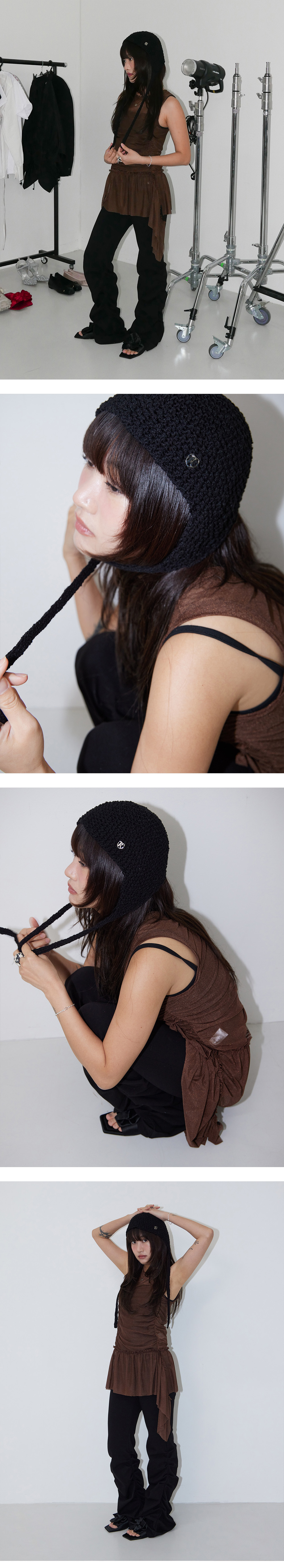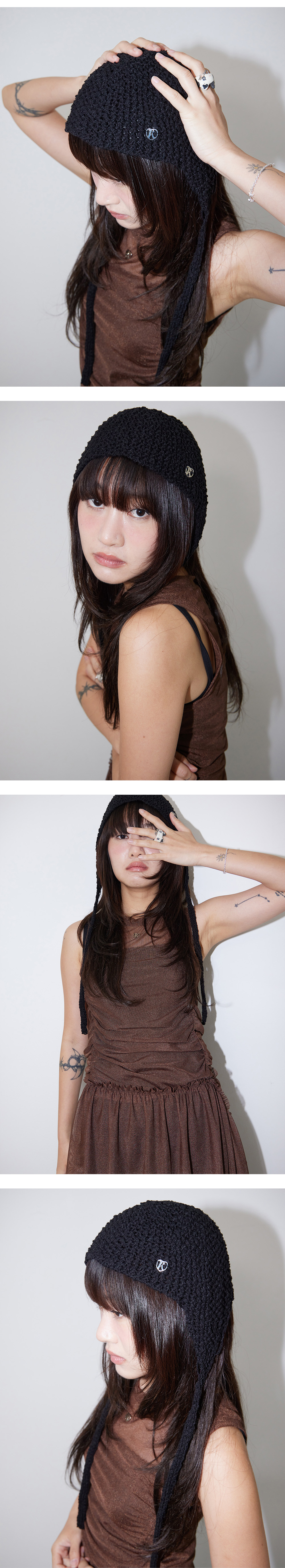뜨게질 디테일로 유니크한 감성의 보넷 모자, 앞 뒤로 착용 할 수 있어 다양한 연출 가능, 시어한 재질의 원단으로 사계절 착용 가능, 엣지 메탈 로고 포인트