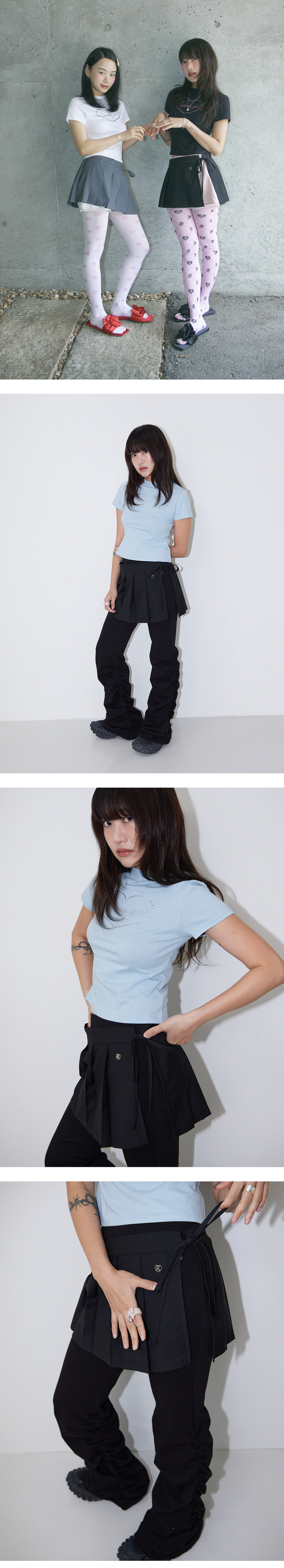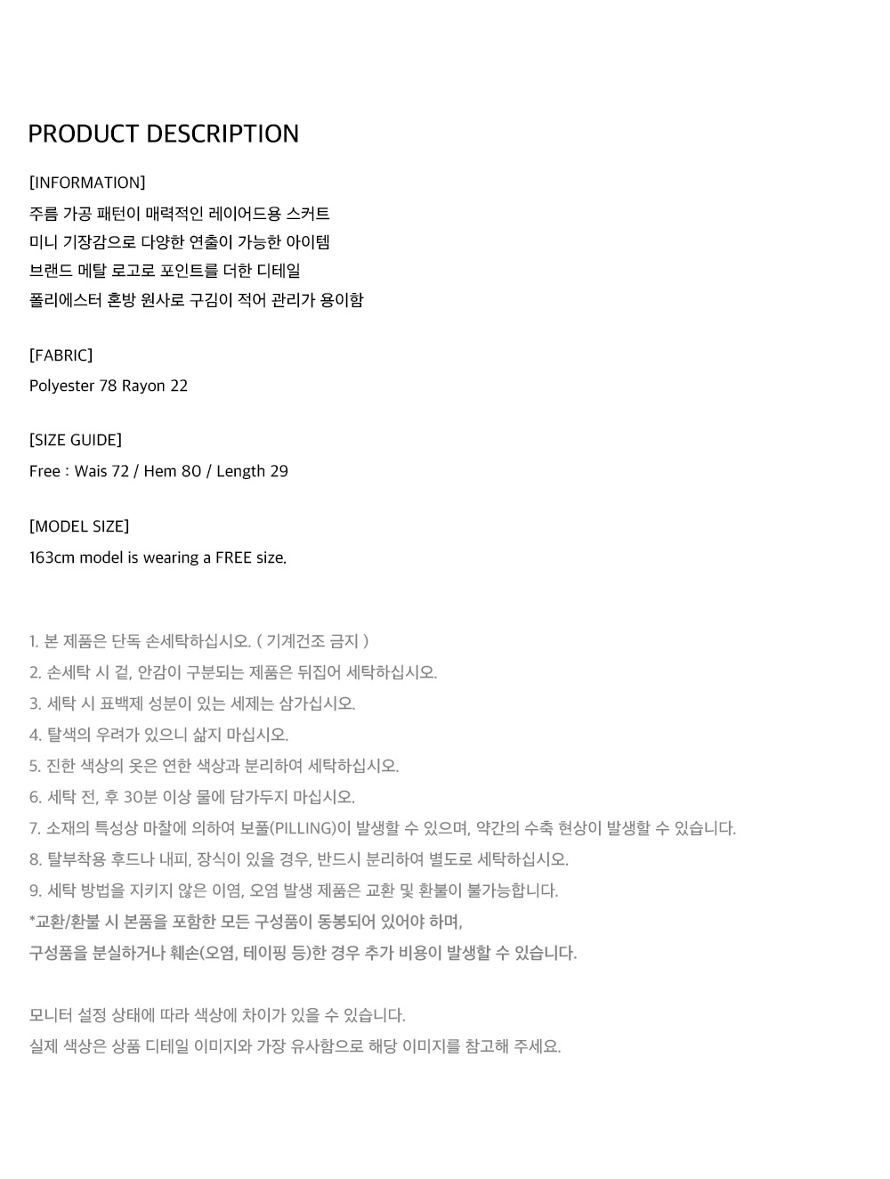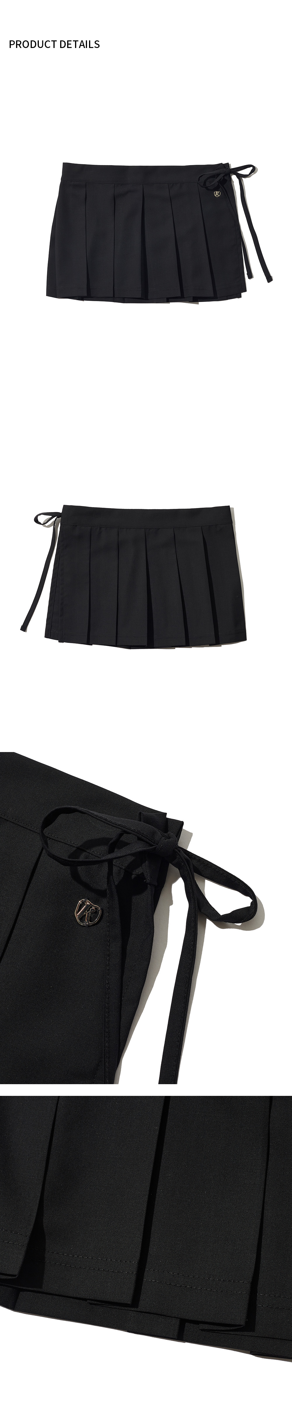 주름 가공 패턴이 매력적인 레이어드용 스커트, 미니 기장감으로 다양한 연출이 가능한 아이템, 브랜드 메탈 로고로 포인트를 더한 디테일, 폴리에스터 혼방 원사로 구김이 적어 관리가 용이함