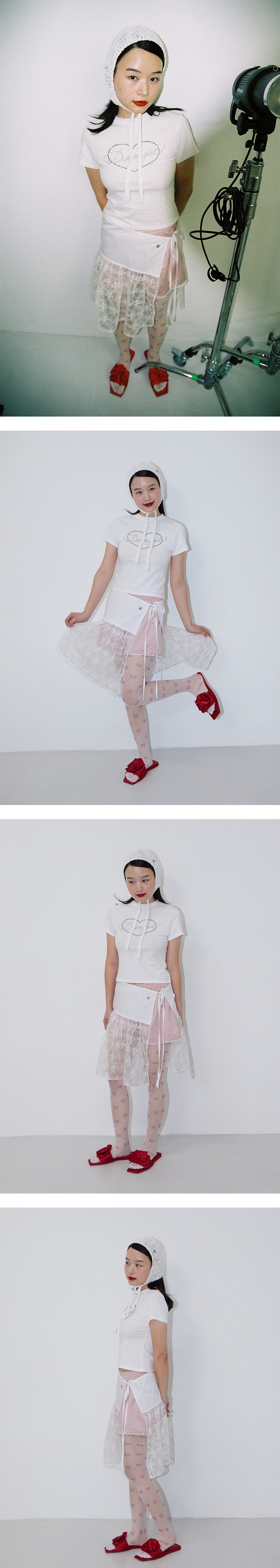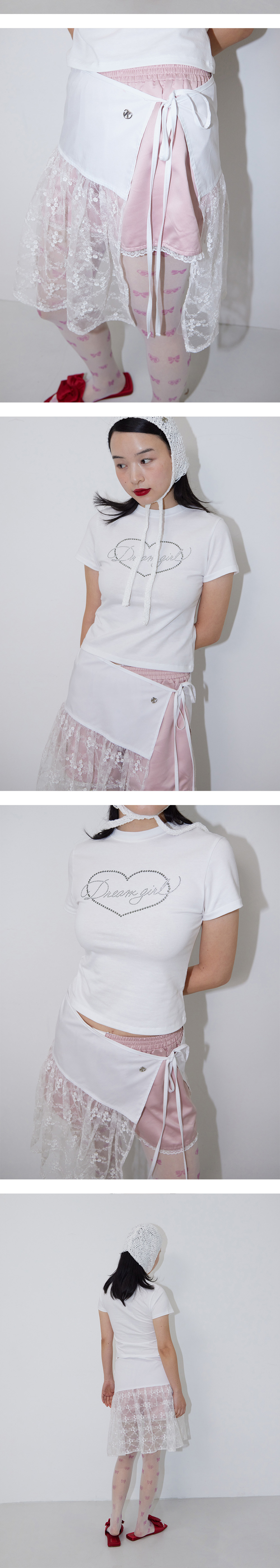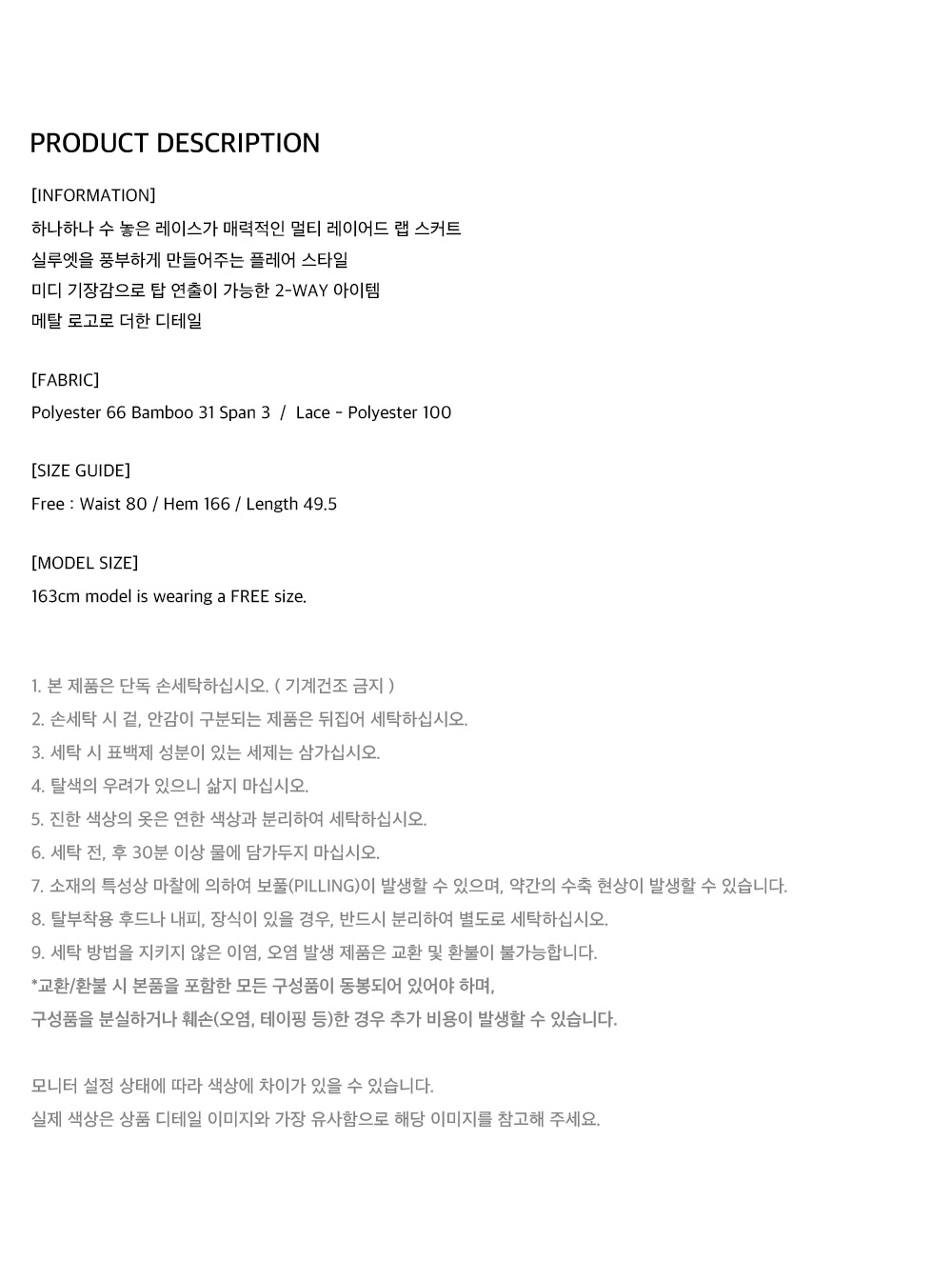 셔츠 원단과 레이스 원단의 혼합으로 매력적인 레이어드용 스커트, 레이어드를 풍부하게 만들어주는 플레어 스타일, 미디 기장감으로 탑 연출이 가능한 2-Way 아이템, 메탈 로고로 더한 디테일
