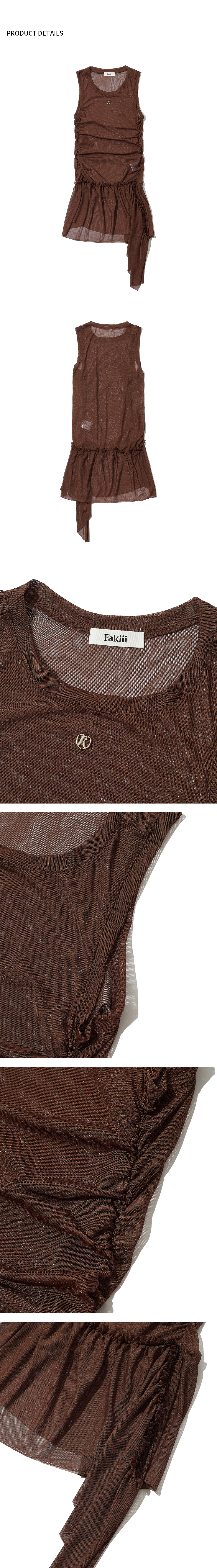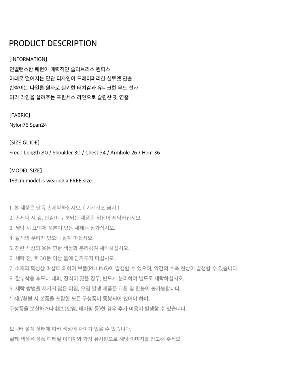 언밸런스한 패턴이 매력적인 슬리브리스 원피스, 아래로 떨어지는 밑단 디자인이 드레이퍼리한 실루엣 연출, 반짝이는 나일론 원사로 실키한 터치감과 유니크한 무드 선사, 허리 라인을 살려주는 프린세스 라인으로 슬림한 핏 연출