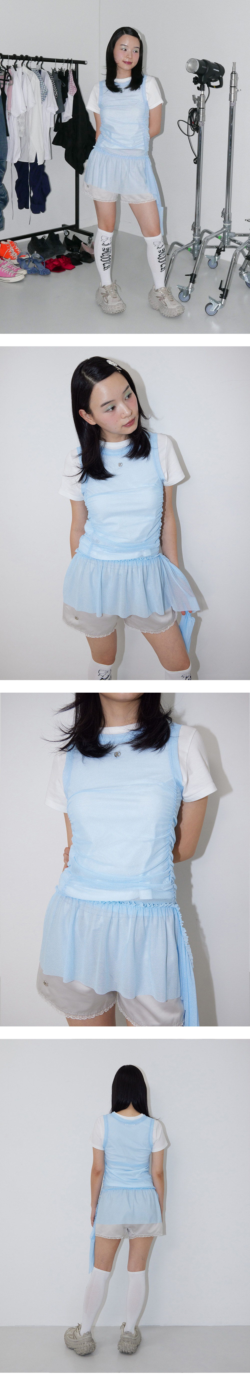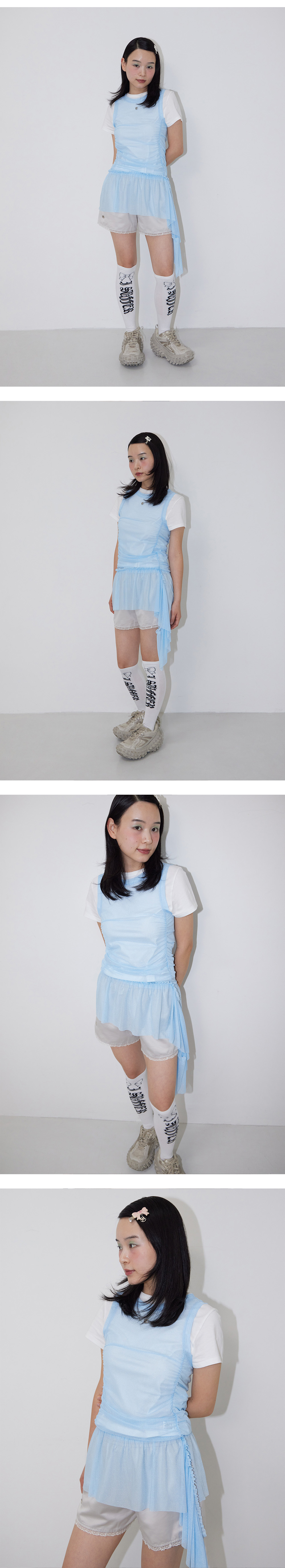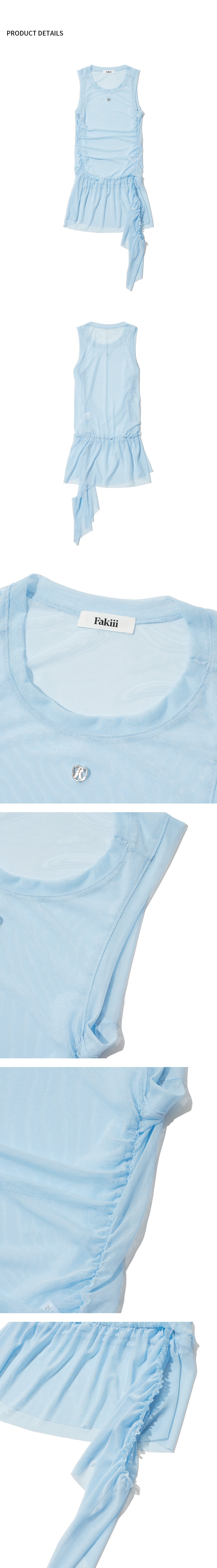 언밸런스한 패턴이 매력적인 슬리브리스 원피스, 아래로 떨어지는 밑단 디자인이 드레이퍼리한 실루엣 연출, 반짝이는 나일론 원사로 실키한 터치감과 유니크한 무드 선사, 허리 라인을 살려주는 프린세스 라인으로 슬림한 핏 연출