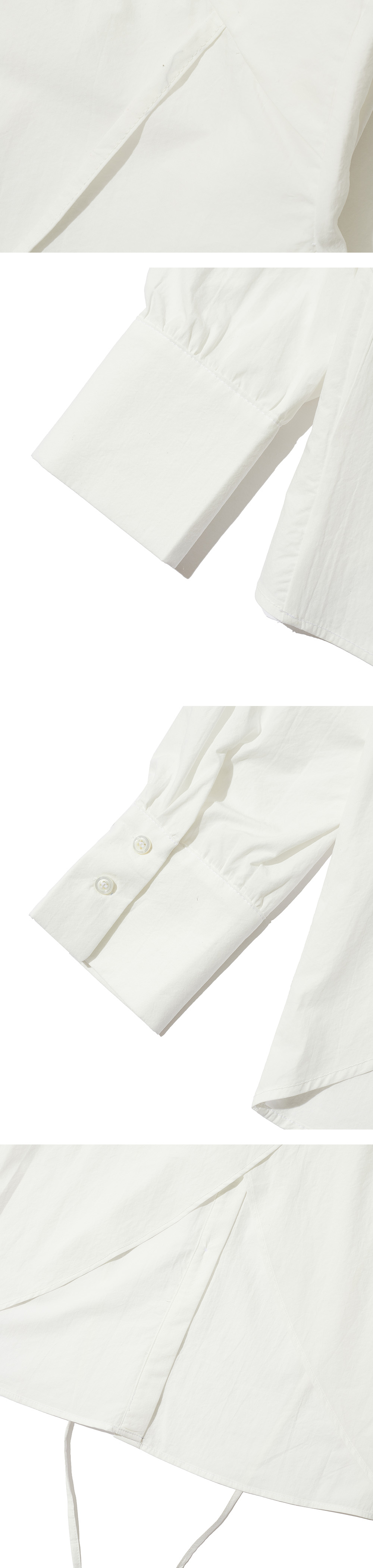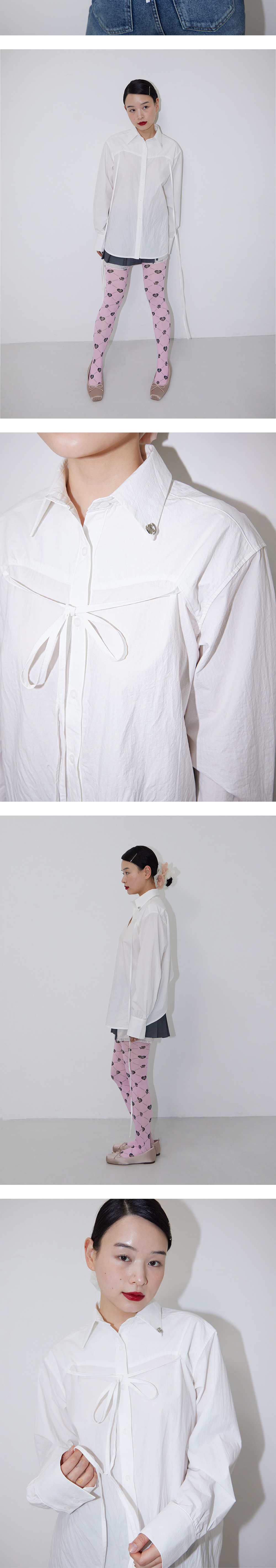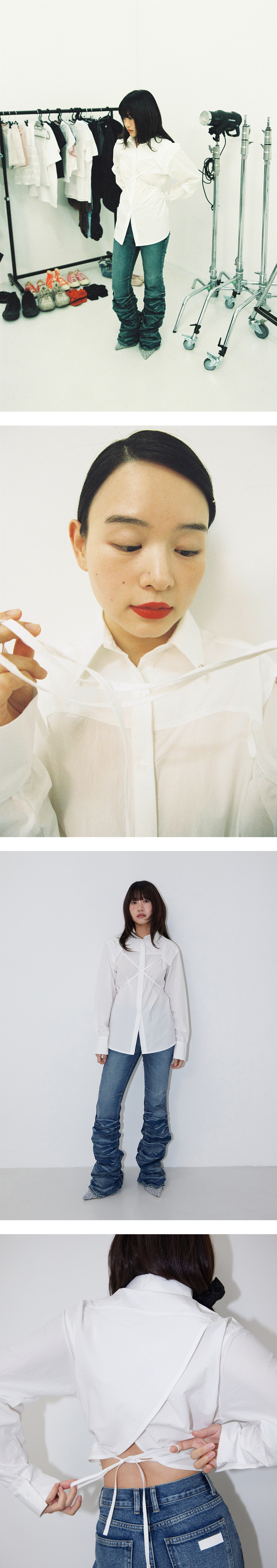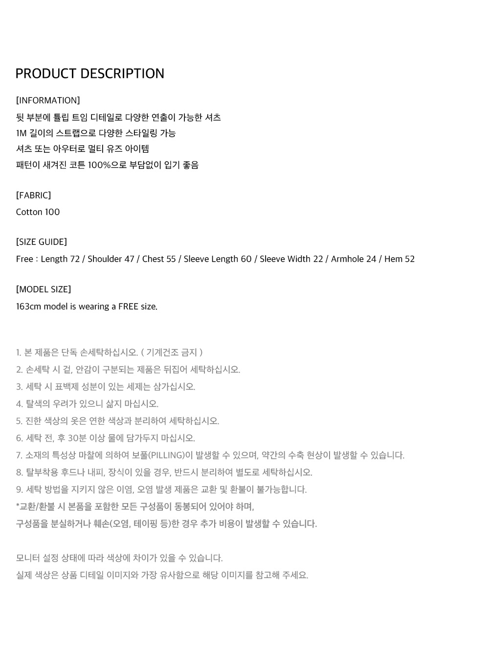 뒷 부분에 튤립 트임 디테일로 다양한 연출이 가능한 셔츠, 1m 길이의 스트랩으로 다양한 스타일링 가능, 셔츠 또는 아우터로 멀티 유즈 아이템, 패턴이 새겨진 코튼 100%으로 부담없이 입기 좋음