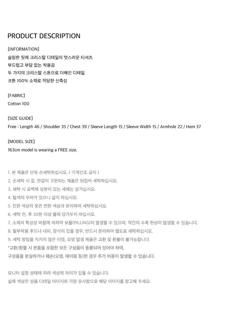 슬림한 핏에 크리스탈 디테일이 멋스러운 티셔츠, 부드럽고 부담 없는 착용감, 두 가지의 크리스탈 스톤으로 더해진 디테일, 코튼 100% 소재로 적당한 신축성