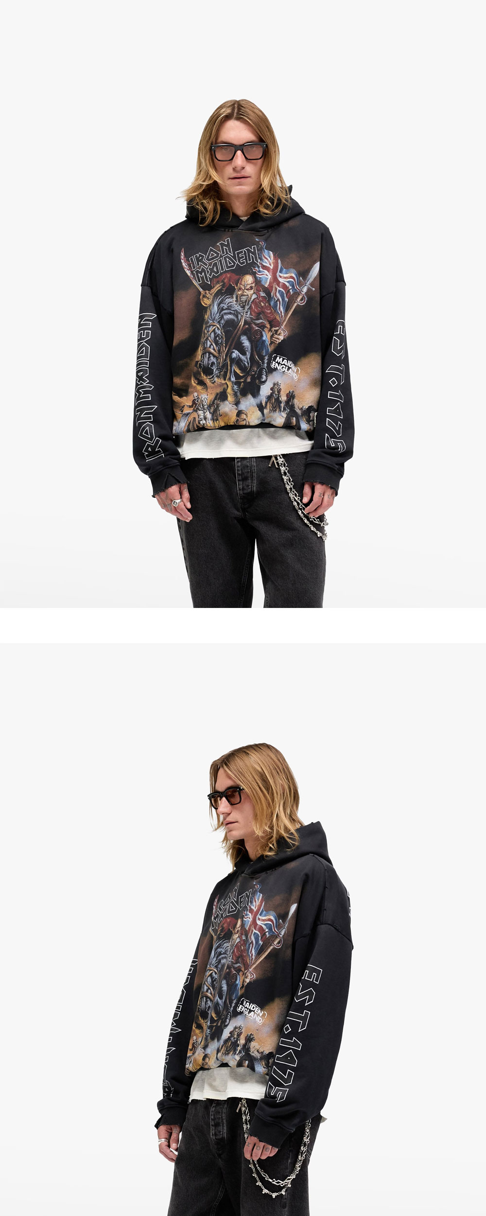 전설적인 Maiden England 아트워크가 전면과 후면에 더해진 리프레젠트 x 아이언 메이든 스티드 후디 스테인드 블랙 컬러입니다. -Stained Black 컬러웨이 -박시 핏 -480GSM 코튼 루프백 저지 -전·후면 및 슬리브 그래픽 프린트 페이드 아웃 워시 디테일 -빈티지한 크랙 프린트 효과 -리브드 헴과 커프 -밑단의 시그니처 메탈 바 -Iron Maiden × Represent 50주년 칼리코 라벨 *모델은 185cm, 78kg 이며 M사이즈를 착용했습니다.*
