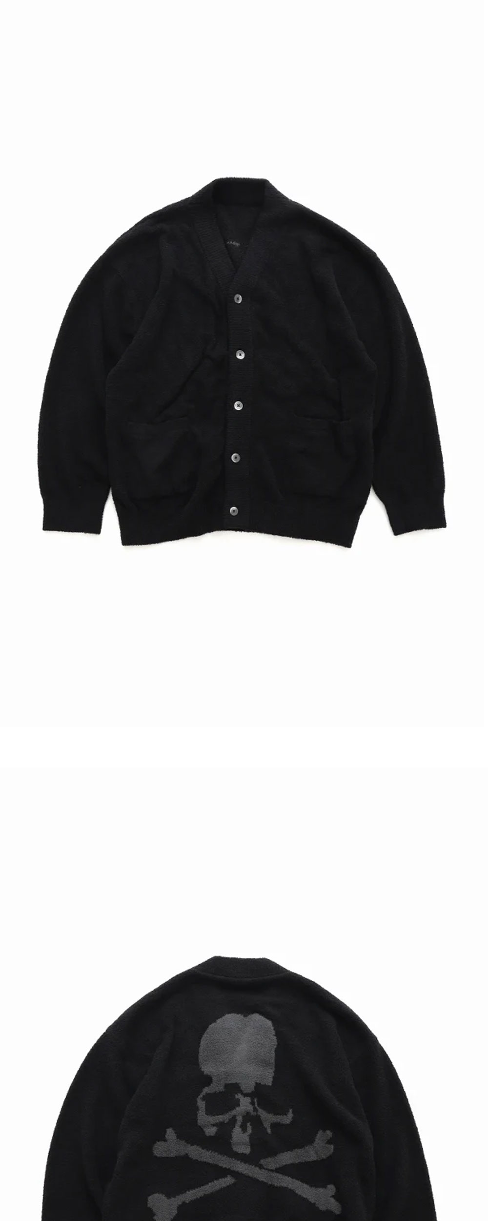 후면 시그니처 스컬 로고가 포인트인 마스터마인드 월드 x 룸웨어 라운지 가디건 블랙 차콜 컬러입니다. -전면 2 포켓 -5버튼 클로저 -브이넥 디자인 -후면 마스터마인드 시그니처 스컬 로고